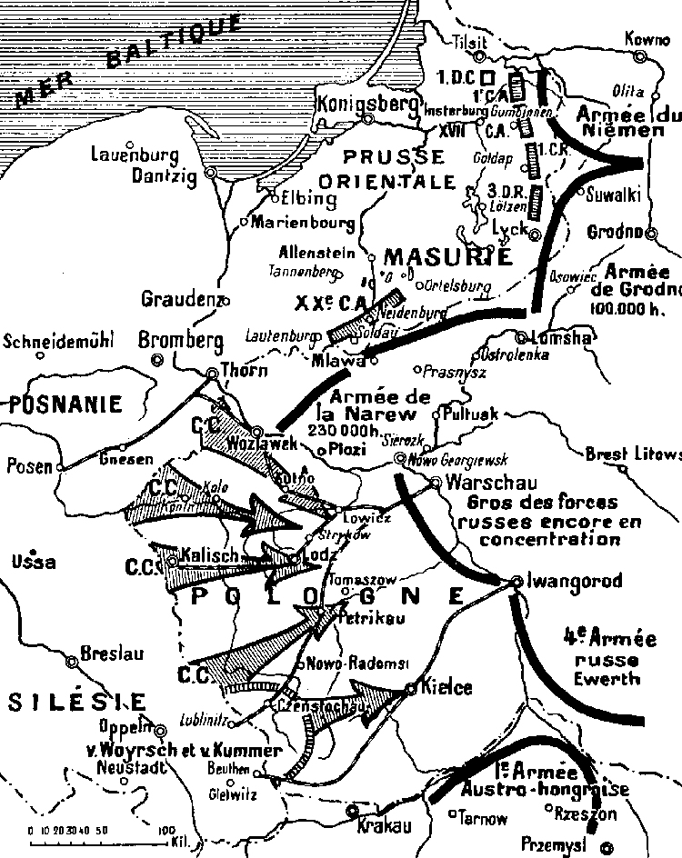 Hindenburg se décida à exécuter une attaque de flanc, en venant du nord et en partant de la ligne Gnesen-Thorn, contre l'aile droite du gros des forces russes, qui s'avançait sans méfiance de Varsovie sur Kalicz par Lodz.