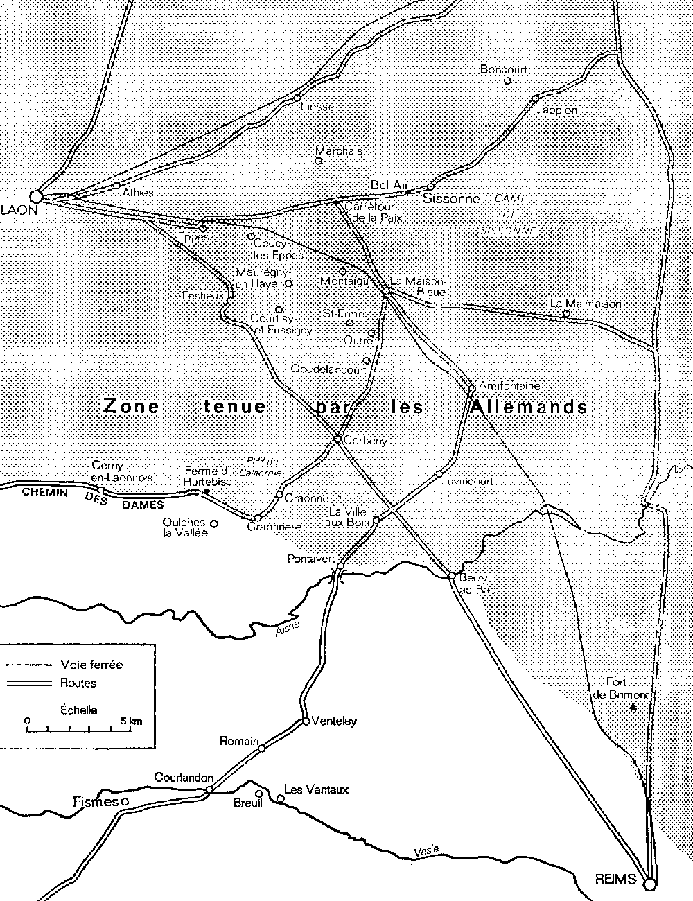 Le bataillon du 45e d'infanterie, qui a rejoint pendant la nuit avec ses autobus, a été orienté sur La Maison-Bleue (voie ferrée de Reims à Laon) qu'il tient en ce moment, menaçant l'ennemi sur ses flancs.