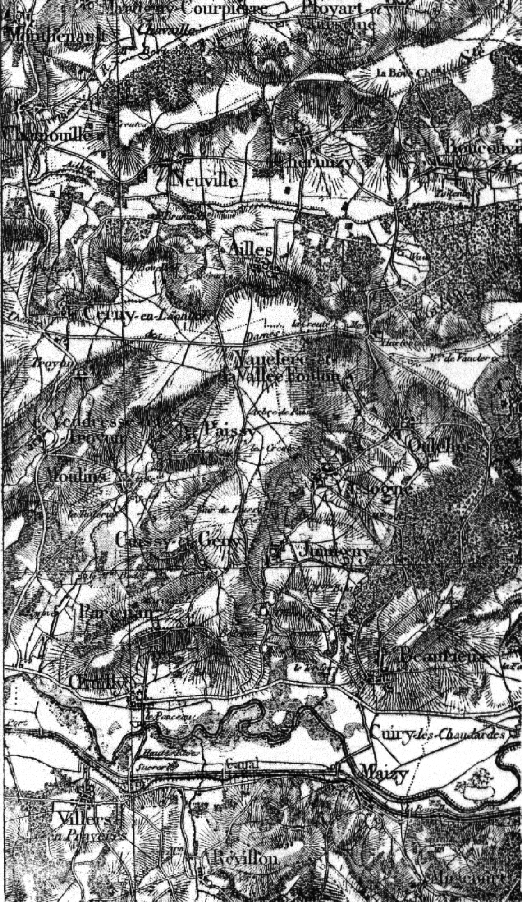 Vers midi, la rivière est franchie sur toua les ponts. A 13 heures, la division Muteau occupe facilement Pargnan et Geny. C'est le plateau de Paissy qui tombe dans la main des Alliés ; on touche au Chemin des Dames. La colonne de gauche débouche de Beaurieux sur Craonnelle et Hurtebise ; la colonne de droite traverse Pontavert et se porte sur Corbeny. Voilà donc le couloir d'Amifontaine qui est dominé à l'ouest et la manœuvre d'encerclement du massif par l'est qui s'annonce bien. La 35e division s'empare après un brillant combat, des points d'appui de la Ville-aux-Bois, Corbeny, Craonne... La Ville-aux-Bois, Corbeny, Craonne, ces points qui nous donneront tant de mal pendant les quatre années de guerre de tranchées ! La 36e division occupe Oulches, aux portes d'Hurtebise.