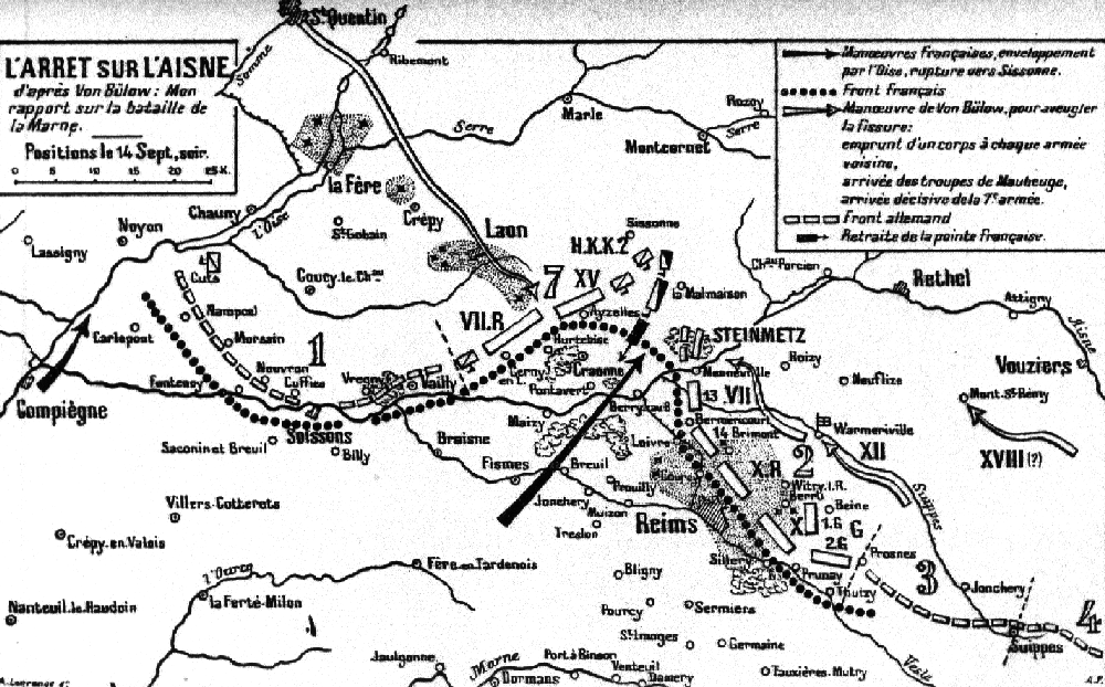 le 18e corps les protège du haut du plateau de Craonne et s'avance lui-même sur Hurtebise, qui est la clef de la position. Mais peu à peu les premières avant-gardes ennemies paraissent : d'abord les uhlans, puis la cavalerie, puis une puissante artillerie : c'est la 28e brigade du VIIe corps de réserve qui a quitté Laon dans la nuit du 12 au 13 et que suit le reste du corps d'armée ; c'est bientôt le XVe corps de l'armée von Heeringen qui va déboucher sur Corbeny et la trouée d'Amifontaine. A Hurtebise, contre-attaque violente, sur le 18e corps. A Condé-sur-Suippe, à Aguilcourt, contre-attaque violente sur les divisions de réserve : c'est la 13e division du VIIe corps; elle tient la droite de Bülow depuis l'Aisne et Aguilcourt jusqu'à Berméricourt, où elle sa relie à la 14e division qui tient Brimont. En un mot ? c'est la manœuvre de von Bülow, lançant ses troupes et ses renforts dans la coupure, qui prend forme. Ce soir même, 13 septembre, von Stein va apporter aux quartiers généraux des IIIe, IVe et Ve armées l'ordre de l'empereur de céder un corps de chacune de ces armées (XIIe, XVIIIe, XIIIe) pour renforcer encore le front de Bülow et la trouée d'Amifontaine. On va donc trouver ici des forces imposantes, partout ailleurs des positions retranchées. L'Aisne est franchie, mais elle n'est pas dépassée. Ainsi commence la rude bataille qui portera la nom de cette rivière.