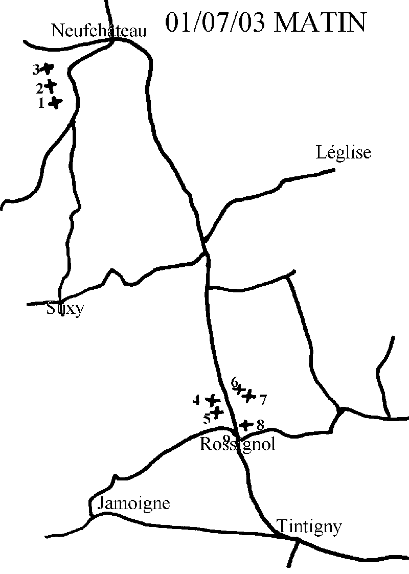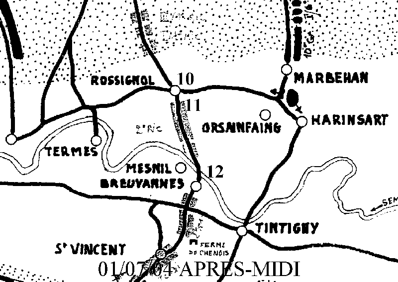 4 - La progression de la colonne de droite de la 3ème D.I.C. et les mouvements des XIème et XIIème D.I.All., le matin du 22 août. La tragique situation de la mi-journée.