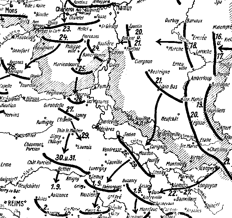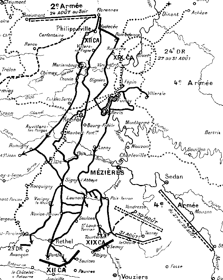4 - Les IIIème et IVème Armées Allemandes, à la fin août traversent la région de Charleville-Mézières. 5 - Le 22 août, les 9ème et 11ème C.A. couvrent l'est de la région de Charleville-Mézières. Ils seront le cœur de la 9ème Armée aux Marais de Saint-Gond. 6 - La prise du Fort des Ayvelles après deux jours de bombardement intensif. Après la guerre de 1870, la France veut fortifier ses frontières. Plan Séré de Rivières.