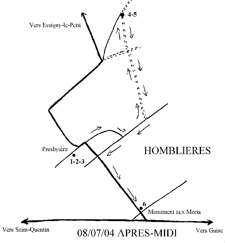 Après le pique-nique à Saint-Quentin, les marcheurs reprennent leur voiture pour se rendre à Homblière, à 3 km de Saint-Quentin sur la route de Guise (N29). Rendez-vous au Presbytère d'Homblières, point de démarrage des exposés et de la marche de l'après-midi.