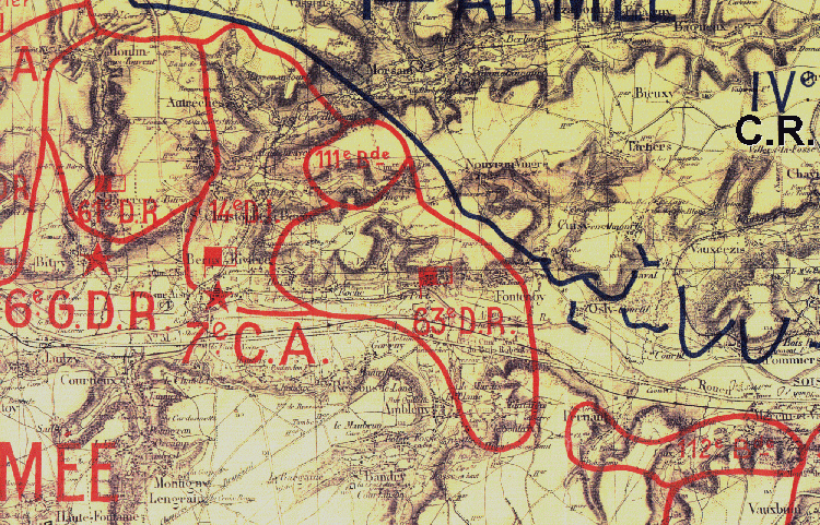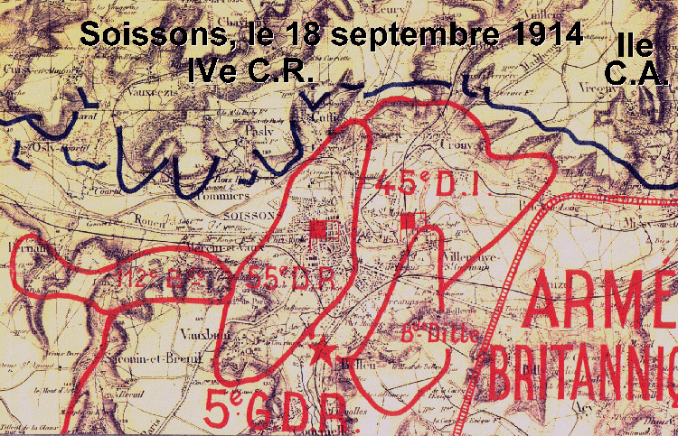 11 – la 45ème D.I. entre dans Soissons, les combats incertains pour progresser sur la rive nord de l'Aisne - Le Groupe de Divisions de Réserve du Général Lamaze ne parvient pas à franchir l'Aisne entre Fontenoy et Soissons