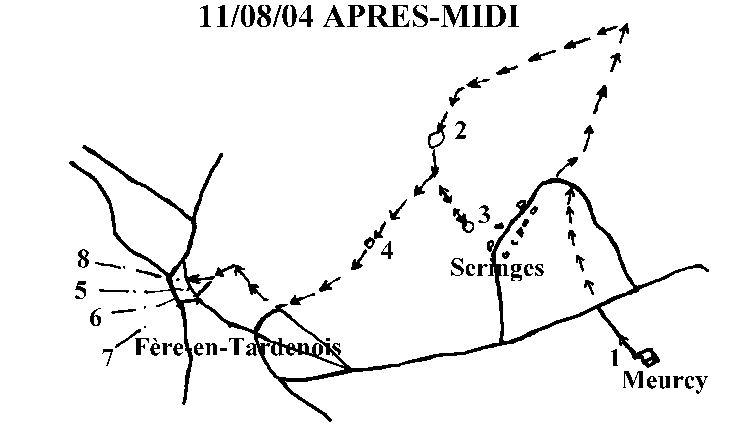 2 - Le 11 septembre, les Britanniques se rapprochent au nord ouest de Fère-en-Tardenois (Le 11 au soir, la D.C. Britannique vers Maast), en effet ils ont amorcé le changement de direction vers les nord-est. Pour le 12 : 1er C.A. vers l'ouest de Bazoches, 2ème Braine et 3ème C.A. vers l'est de Soissons. Le 2ème C.C., comme nous allons le voir, change aussi de direction le 11, vers le nord-est alors que la 5ème armée continue sur sa trajectoire jusqu'au 12. Le 18ème C.A. arrive en fin de journée, sur la région Mareuil-en-Dôle, Chéry sur les arrières des divisions de Cavalerie qui encombrent les routes ( le 2ème C.C., n'est plus à gauche de la 5ème Armée, mais devant)