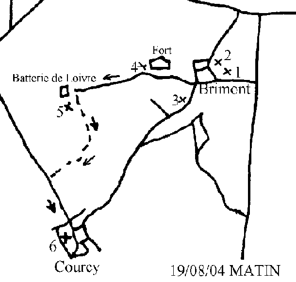 3 - Les combats du 13, 14, 15, 16, 17 septembre avec la reprise du village de Courcy par la 5e D.I. du Général Mangin (3e C.A.). Parcours du 36e R.I.. Le château occupé par le 2/36e, le 14 septembre, le renfort le 15 au matin du 1/129e, 9e Brigade, du Commandant Duchemin, qui prend le commandement, la ferme résistance des unités jusqu'à la reddition. Cheminement vers le fort de Brimont 4 - Le fort pendant la Grande Guerre. Au travers du bois de Brimont, marche vers le site de la Batterie de Loivre (ouvrage complémentaire du fort). |