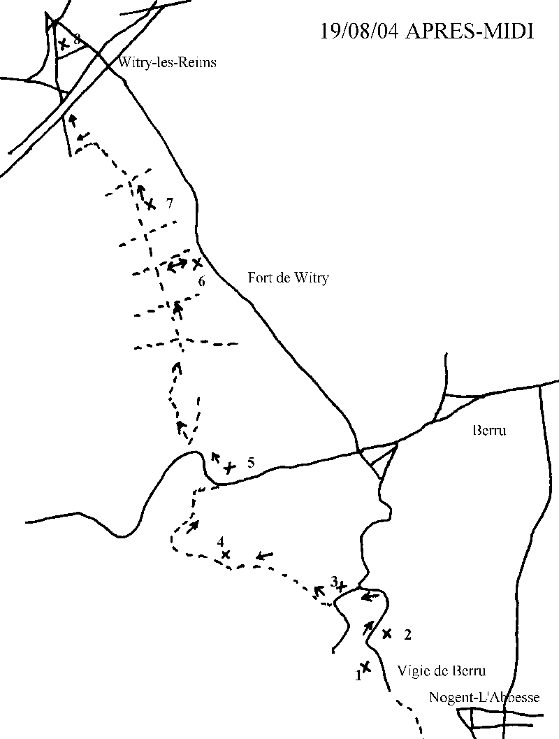 5 - La prise de Courcy par le 129e R.I. et le 39e R.I. (Dorgeles). La prise du village de Loivre par la 6e D.I. (3e C.A.) du général Pétain, 24e et 28e R.I., l'autre brigade progresse vers Berry-au-Bac. Le repli, vers le Massif de Saint-Thierry, au-delà de la R.N. 44, le 18 septembre 1914. Début de la guerre de position. Cheminement vers Courcy