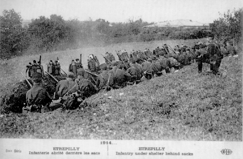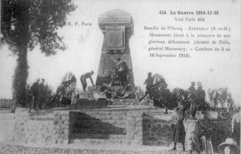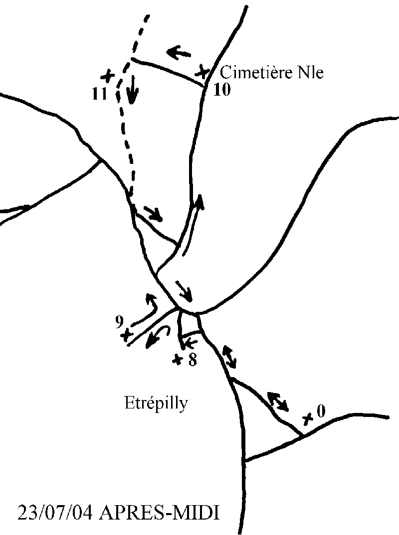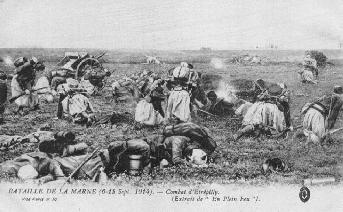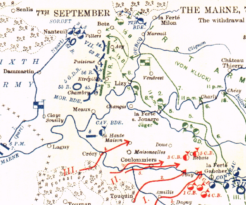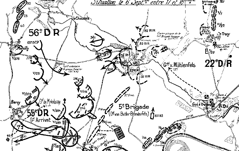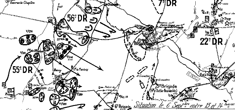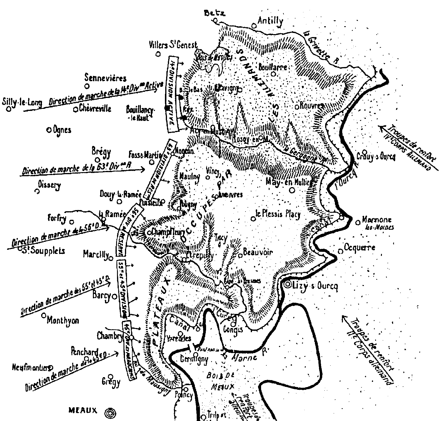 1 - Des collines et des vallées orientées Est-Ouest. Les tentatives de débordement par le nord de la 6ème Armée. 2 - Les tentatives de débordement par le nord de von Kluck, le rappel de ses C.A. au sud de la Marne. 3 - Le 6 septembre, à la mi-journée, la 56ème D.R., du 5ème G.D.R. (Lamaze) attaque vers Etrépilly, échec face à la VIIème D.R.All. 4 - Le 6 septembre, le IIème C.A.All. est repassé au nord de la Marne, IIIème D.I.All. à Varreddes, VIème D.I.All. plus au nord (mélange de régiments). 5 - Le 7 septembre, attaque vers Etrépilly, à gauche le 350ème R.I. jusqu'au N-O d'Etrépilly, au centre 2ème Zouaves de la 45ème D.I., à droite Régiment Indigène Pomeyrau (Poeymirau?) attaque repoussée. 6 - La nuit du 7 au 8 septembre, attaque vers Etrépilly, par le 2ème Zouaves prise de la ville jusqu'au cimetière, mort du Cl Dubujadoux. Les Allemands réoccupent Etrépilly. |