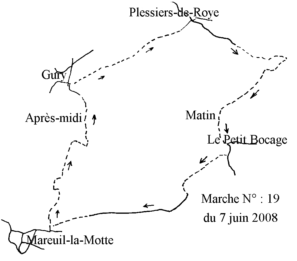 9 heures départ de la marche de la matinée. Le pique-nique des marcheurs est transporté, en véhicule, à Mareuil-la-Motte. Après l'étape du midi à Mareuil-la-Motte, les marcheurs reviennent, l'après-midi, au Plessiers-de-Roye. |