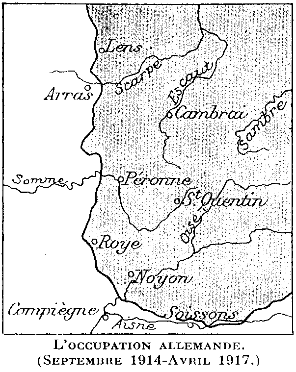Dès novembre 1914 les lignes adverses se fixent à plus de 40 km de Cambrai et Saint-Quentin. Toute la région connaît alors toute la rigueur de l'occupation allemande. Villes et villages deviennent les cantonnements des troupes en secteurs devant Arras. Péronne, Roye, Lassigny. Cambrai est une gare des plus importantes pour les Allemands, troupes de relève, trains de ravitaillement y passent sans cesse. En juillet 1916, la canonnade des batailles de la Somme se fait de plus en plus distincte. Les armées franco-britanniques s'approchent de Bapaume et de Cambrai. En automne 1916, les Allemands évacuent les populations des régions où ils ont l'intention d'organiser leur nouvelle ligne Hindenburg pendant l'hiver 1916-1917. Les pauvres gens quittent leurs demeures, qu'ils ne reverront que complètement ruinées ; la plupart des hommes sont embrigadés pour des travaux de terrassement de la ligne Hindenburg, les femmes et les enfants sont astreints aux travaux des champs en Belgique et dans les Ardennes. |