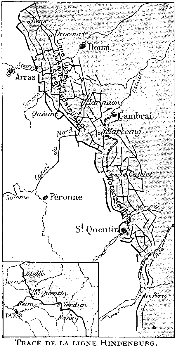 Les Alliés préparaient leur offensive de 1917 ; le saillant de Noyon offrait une prise trop favorable à leurs attaques. En outre, l'offensive alliée de la Somme et la bataille de Verdun ayant provoqué une énorme usure des divisions allemandes, le Commandement allemand avait hâte de reconstituer quelques réserves, en raccourcissant son front défensif. Pendant l'hiver 1916, sous la conduite de compagnies de pionniers, l'Etat-Major allemand fait creuser, par des prisonniers russes, par des civils belges et français des régions envahies, de nouvelles positions défensives, d'Arras à Laon, S'appuyant, au nord, au vaste camp retranché de Lille, au sud, au massif boisé de Saint-Gobain, la nouvelle zone d'organisations barre, en ligne droite, les vastes plaines du Cambrésis et du Vermandois, couvrant la région Douai-Cambrai à une distance suffisante pour que les trafics importants par voie ferrée puissent se faire en sécurité. Le tracé de ces organisations n'est pas déterminé à la fin d'une bataille, au hasard des combats, mais mûrement étudié ; il utilise rationnellement tous les obstacles du terrain, lignes d'eau, canaux et rivières, lignes de hauteurs, croupes et contre-pentes, points dominants, régions boisées, villages et fermes. |