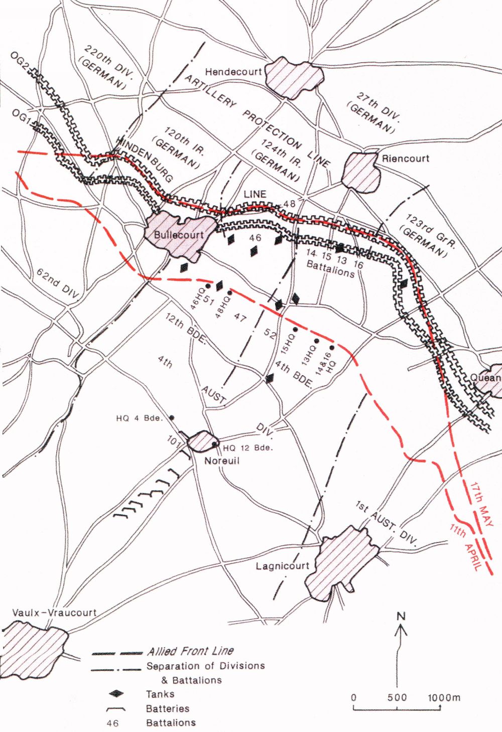 Les Britanniques, après le repli Alberich vont essayer de franchir le ligne Hindenburg. En Artois, en direction de Cambrai, ils font attaquer les Australiens, d'abord le 11 avril 1917, mais les Australiens après avoir progressé seront obligés de reculer, puis le 17 mai où, cette fois-ci, les tranchées allemandes sont prises |