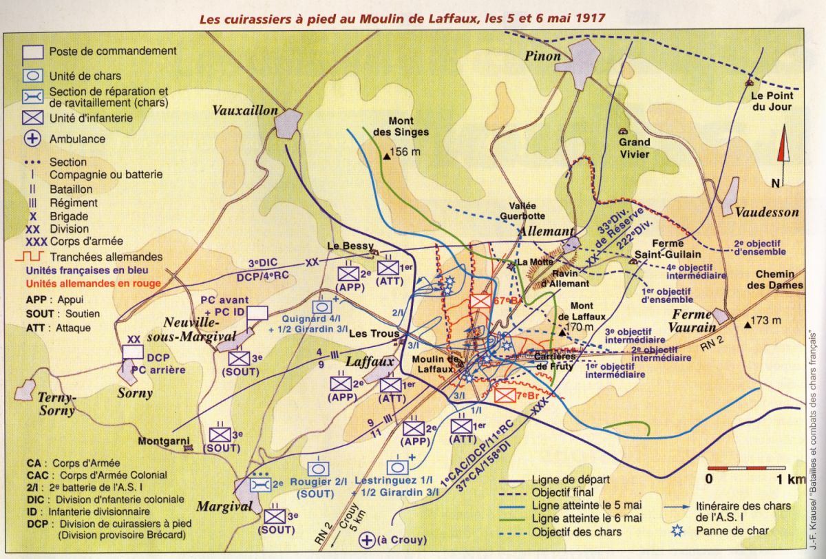 Les troupes s'étaient mises en place le 4 mai au soir. L'attaque fut déclenchée le lendemain à 4 h 45 après une préparation d'artillerie de six heures avec notamment des obus toxiques. Dans la faible clarté du petit-jour les cuirassiers s'élancèrent, appuyés par les chars d'assaut et précédés par un barrage roulant de 75, réglé sur la vitesse de marche de 100 m en 2 mn. Le 4e R.C. était au nord du moulin, le 9e devant le moulin de Laffaux et le 11e à droite devant les carrières de Fruty.