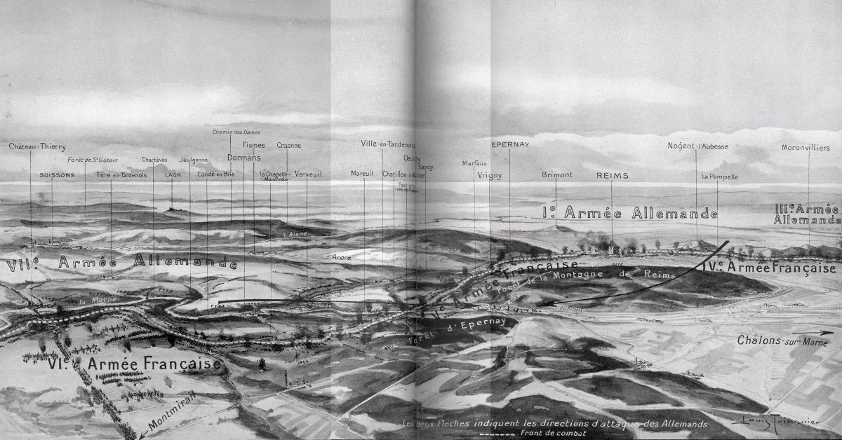 " La VIIe Armée, passant la Marne devait pousser à l'ouest de Château-Thierry, des deux côtés de la rivière, en direction d'Epernay, tandis que les Ire et IIIe Armées attaqueraient de l'ouest de Reims à Tahure, pour avancer leur aile droite le long de la montagne de Reims, en direction d'Epernay, l'attaque principale étant dirigée sur Châlons-sur-Marne... " Et, après avoir noté que le front d'attaque offrait au départ une solution de continuité, le général allemand fait remarquer que à la réunion des deux groupes d'attaque en direction d'Epernay, pouvait amener un grand résultat. "