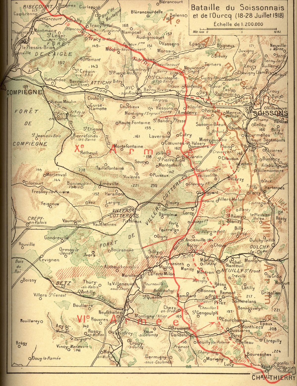A la fin de la journée, la Xe armée a sa gauche devant les faubourgs de Soissons ; au centre, elle a dépassé Ambrief et Nampteuil ; sa droite est à Branges.