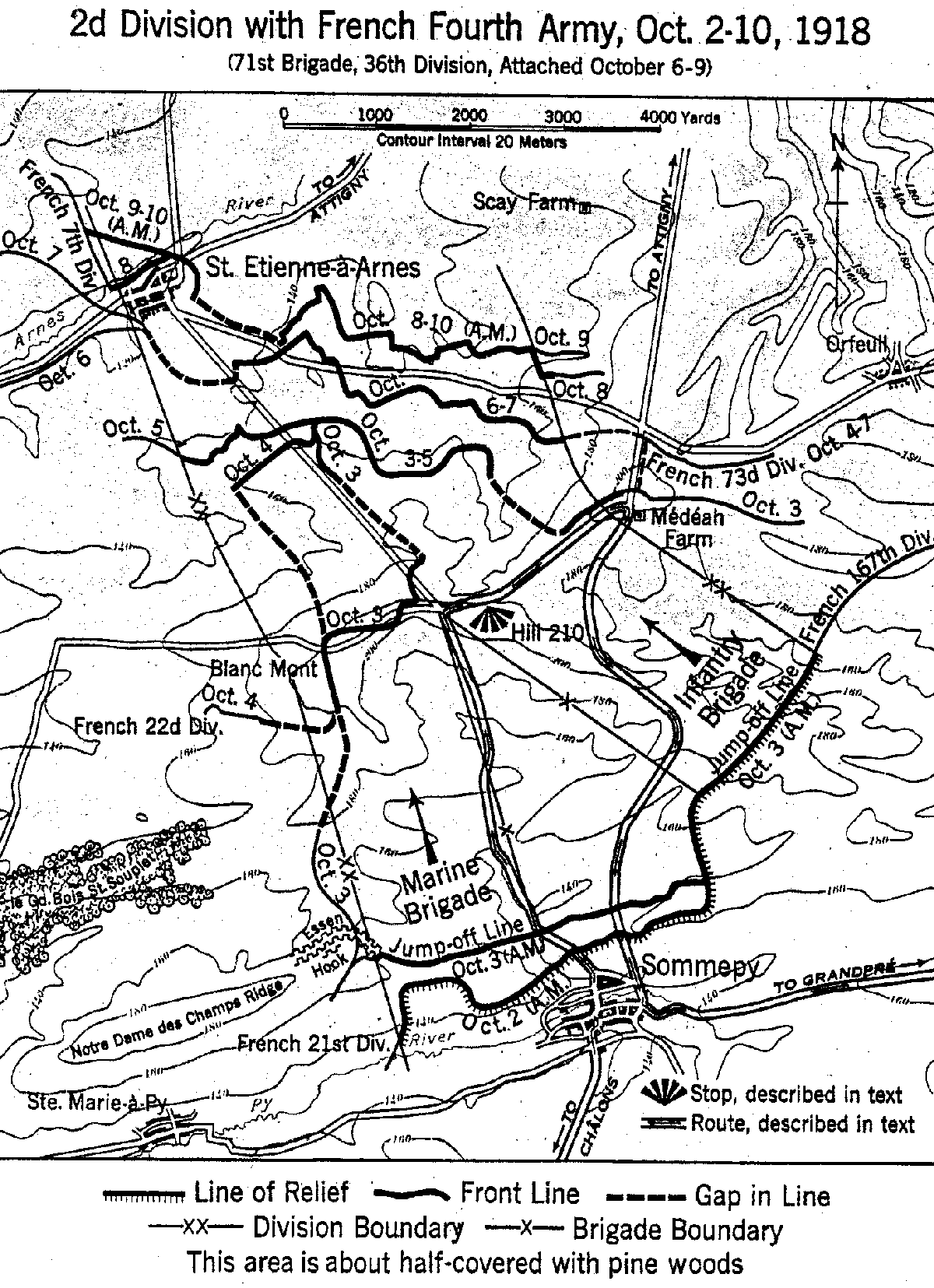 Des éléments de la 36ème D.I.U.S. durent avancer pour combler les trous et soutenir la position périlleuse. Des unités des deux divisions collaborèrent le 7 et 8 octobre pour prendre les nids de mitrailleuses du village de Saint-Etienne-à-Arnes qui fut le choc décisif sur la défense allemande.