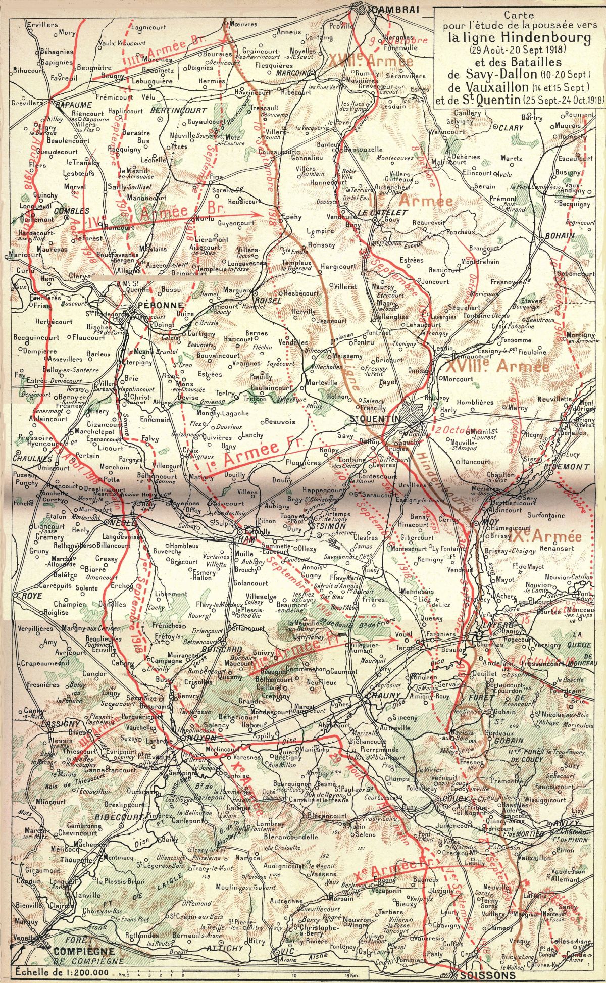 Dans sa note du 30 août et dans sa directive du 3 septembre, le maréchal Foch avait prescrit que les armées britanniques, appuyées par la gauche des armées françaises, continueraient à attaquer dans la direction de Cambrai et de Saint-Quentin.