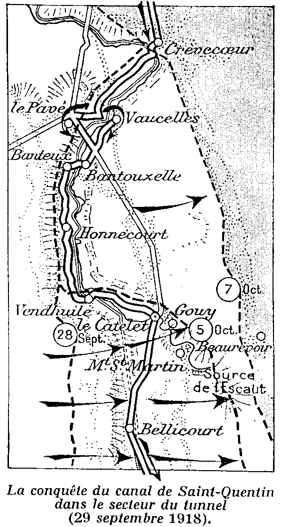 Face à l'ouest, s'étend le secteur d'attaque du 9e corps britannique (Braithwaite), le 29 septembre 1918. Le fossé profond du canal constituait un obstacle redoutable. Dès le 27, l'artillerie britannique bat les obstacles pendant deux jours par le feu de 500 pièces de tous calibres. Le 29, à 5 h. 30, à la même heure que les Américains plus au nord, les North-Midlanders de la 46e D. I. s'élancent sur la ligne avancée qui couvre le canal. Sans grandes pertes, les assaillants arrivent au bord du large et profond fossé. " Les hommes, munis de trois mille ceintures de sauvetage, s'élancent en avant, reculent comme des chiens de chasse désemparés en quête d'un endroit propice, puis se jettent à l'eau en se laissant tomber, coulent ou nagent, tandis que leurs vaillants officiers traînent des cordes derrière eux en traversant. Toute la surface du canal, sur un espace de plus d'un mille, est parsemée de têtes; des câbles, des débris de ponts, des radeaux de fortune et des barques percées sont utilisées. En quelques instants, l'infanterie anglaise, mouillée jusqu'aux os, est dans les tranchées de la rive est; l'effet moral produit par leur exploit hardi sur l'adversaire, enlève à ce dernier toute ardeur combative. " (Conan Doyle : History of the War.) |