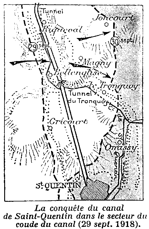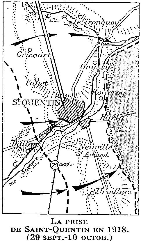Lorsque les Britanniques auraient franchi, le canal, le 15e corps (de Fonclare) déboucherait au nord de la ville. En même temps, le 31e corps attaquerait sur le plateau d'Urvillers, débordant Saint-Quentin au sud. Le 36e corps (Nollet), face à la ville, dont la fameuse 133e division " la Gauloise " (Valentin) avait enlevé, du 18 au 25 septembre, les redoutables positions de l'Epine de Dallon, traverserait la ville, la nettoyant rapidement, puis continuerait son mouvement vers l'est. Le 29, l'attaque commence et rencontre partout une résistance opiniâtre. Le 30, la route Cambrai-Saint-Quentin est franchie par le 15e corps ; le 1er octobre, bousculant les premiers éléments allemands, il se jette sur Omissy, tente de franchir le canal où crépite toute une ligne de mitrailleuses. Un groupe de bataillons de chasseurs passe le canal au tunnel du Tronquoy. Bousculé au nord et au sud de la ville, l'ennemi se replie devant Saint-Quentin. |