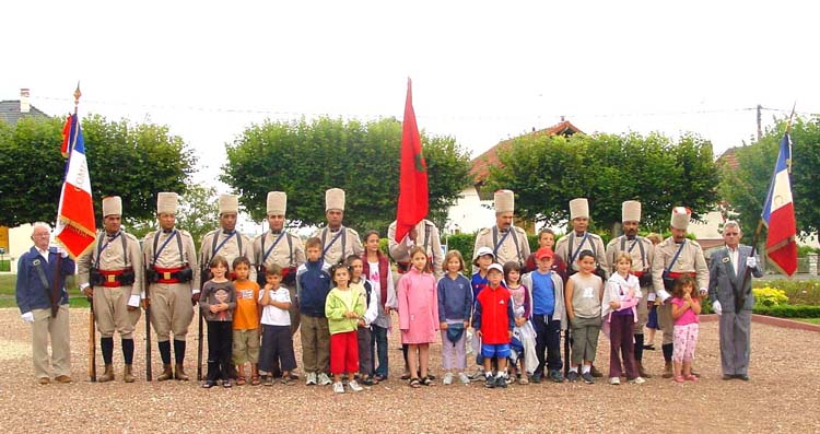 Nos amis marocains, de 1914, suivis par les enfants, conduisent le cortège vers le monument aux Morts
