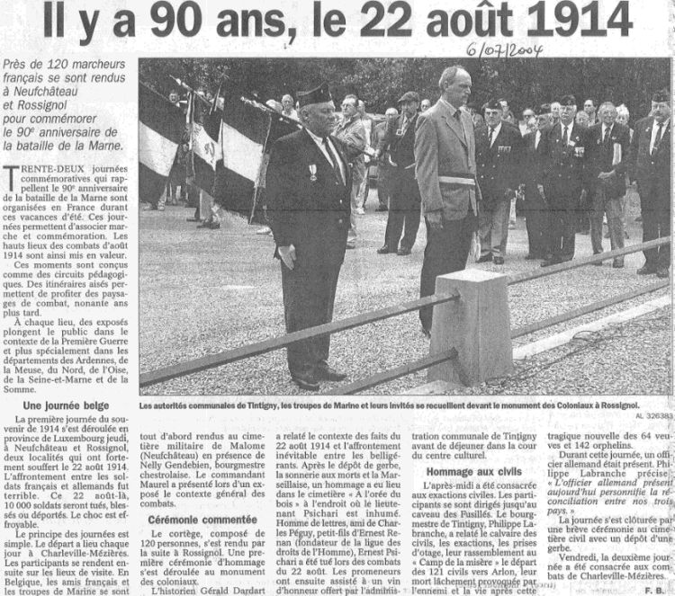 Rossignol fut au départ des terribles combats d'août 1914. Hier débutait dans le village une commémoration qui durera 32 jours. Plus de 150 Français y participaient. JEAN-LUC BODEUX C 'est un peu un devoir de mémoire. Le grand-père de mon mari est mort dans ces combats. Pas ici, mais en France. Demain, on part en vacances, mais on voulait au moins revivre une journée de ces commémorations. Je regrette de ne pas avoir fait venir plus de gens de ma famille |