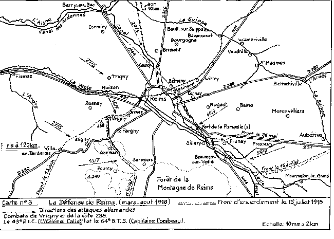 L'énergique intervention du 43ème R.I.C., luttant à un contre deux, pour refouler les 341ème et 343ème I.R. allemands, stoppa l'avance ennemie en ce point. Mais l'adversaire avançait également plus au Sud en direction d'Epernay (voir carte n° 2). La situation était très grave et une fois encore la volonté et la force d'âme du Général MAZILLIER conjuguées au courage et à l'héroïsme des soldats coloniaux permirent d'arrêter définitivement l'avance allemande. Il faut rendre hommage aux glorieux combattants européens, africains et algériens, qui participèrent à la défense de Reims.
