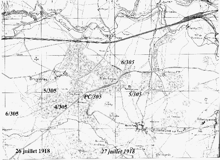 " Le 26 juillet 1918, le 5e Bataillon du 305ème R.I.par sa gauche s'appuie sur le chemin de terre Coincy-Bruyères. 4e Bataillon par sa gauche chemin de terre de la Carrière au Coq-Hardi. 6e Bataillon en liaison à droite avec 4e sa gauche à hauteur moulin de la Poterie, à 400 m à l'est de la route La Poterie - Nanteuil assure liaison avec 11e R.I. Pertes légères