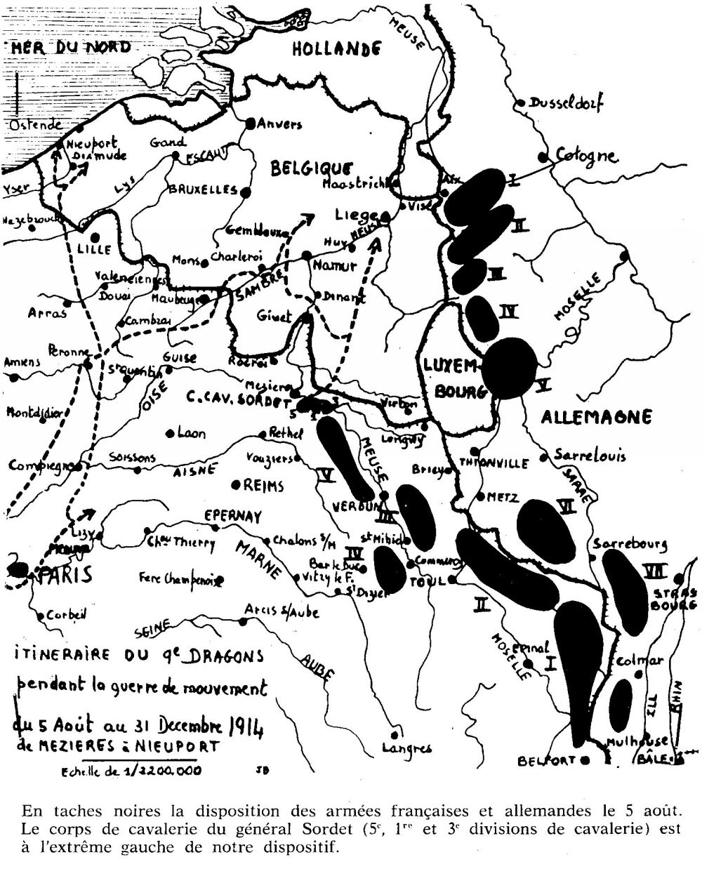 Voici donc notre régiment en route vers la Meuse que nous franchissons le 15 août à Hastière, après avoir livré sur notre flanc droit à Pondrome et à Houyet, les 12, 13, 14 août des combats contre les avant-postes allemands de la 3e Armée. Pendant que nous franchissons le fleuve, d'autres éléments du 1er Corps de Cavalerie repoussaient à Dinant les Allemands sur la rive droite de la Meuse (Le coup de main de la Meuse sur Dinant fit comprendre à Joffre la manœuvre allemande de débordement et le décida à porter sur la Sambre la 5e Armée (général Lanrezac).).