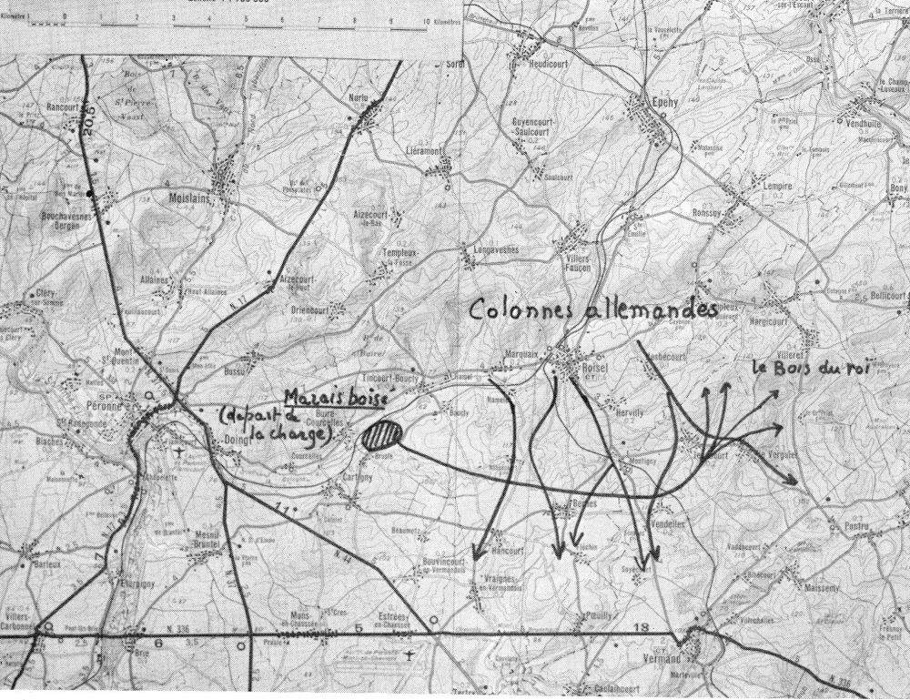 Pour nous, il s'agit maintenant de rejoindre le régiment et la division. Nous sommes un peu étonnés d'apprendre que le point de ralliement est situé au nord de Péronne, région que nous avons repérée le matin comme bien proche des avant-gardes allemandes. Effectivement, à peine étions nous partis que le point de rassemblement fut changé et reporté au sud de la Somme, mais nous ne fûmes pas prévenus à temps, et ce fut la cause de notre destruction.