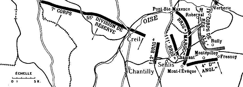 La brigade marocaine prend sa position de couverture sur la ligne Pont-Sainte-Maxence, Mont-I'Évêque. La 111ème brigade de la 56ème division est en soutien à Chamant et la 112ème en réserve à l'ouest de Senlis ; la cavalerie est en avant des Marocains.
