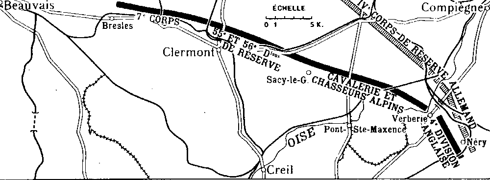 A la date du 1er septembre, la 6ème armée occupe la ligne Bresles, Clermont, Sacy-le-Grand, Verberie. La 4ème division anglaise la prolonge sur la droite.