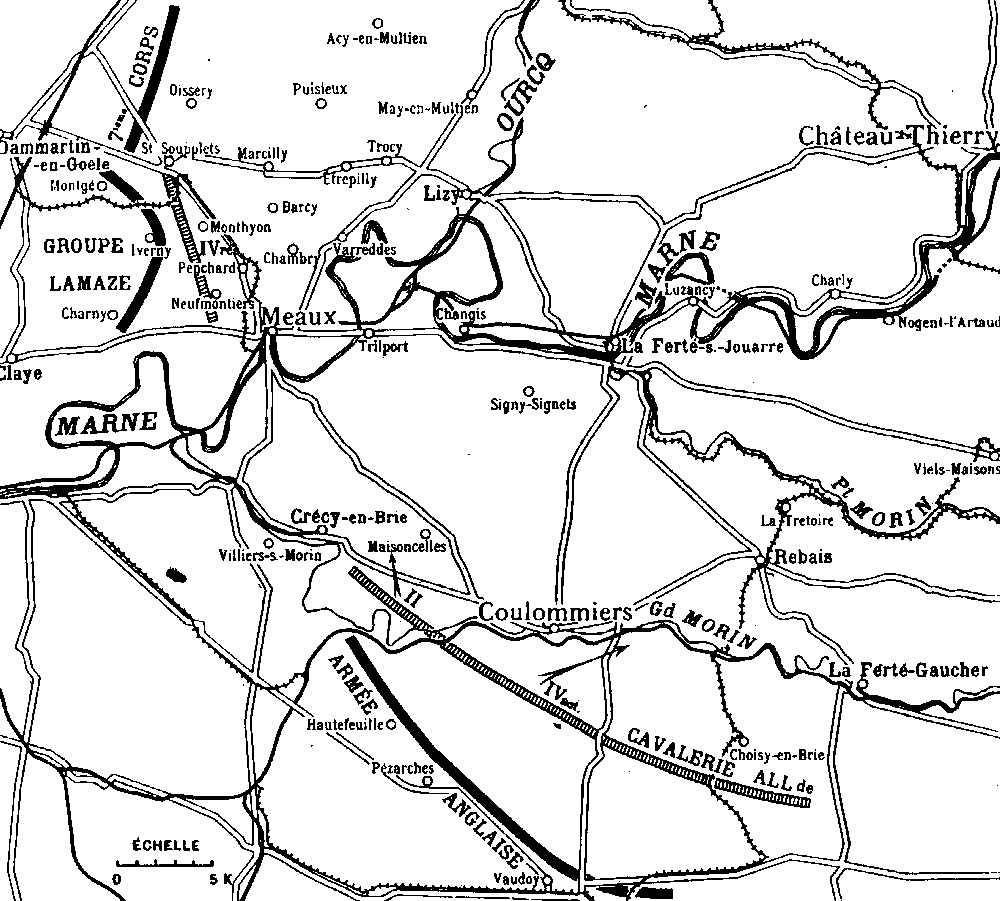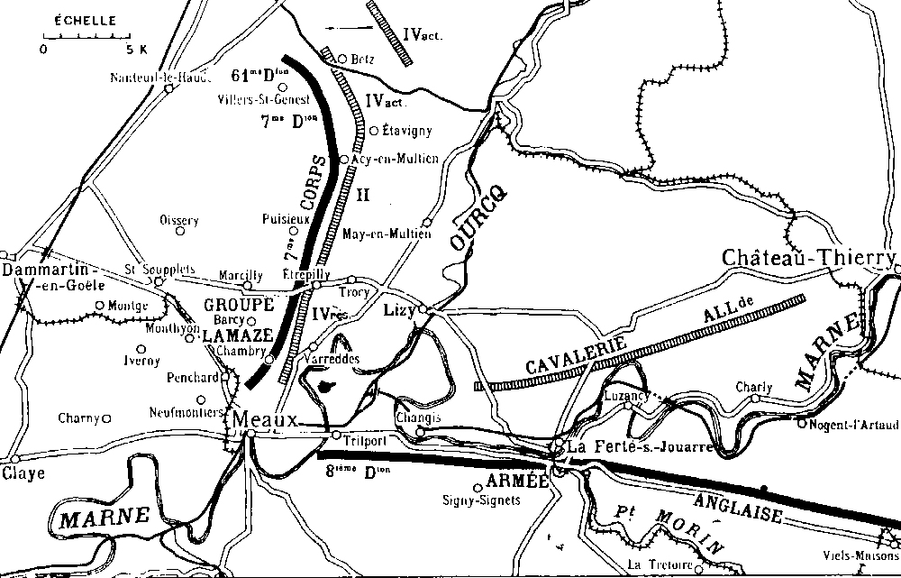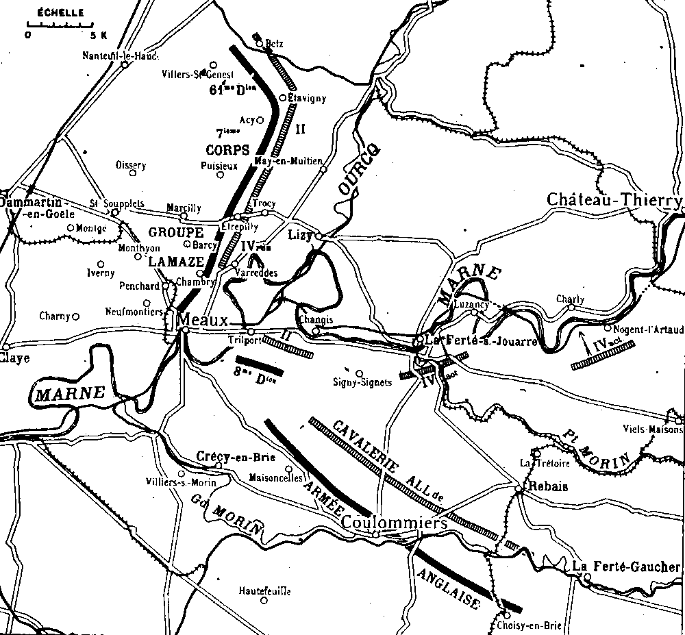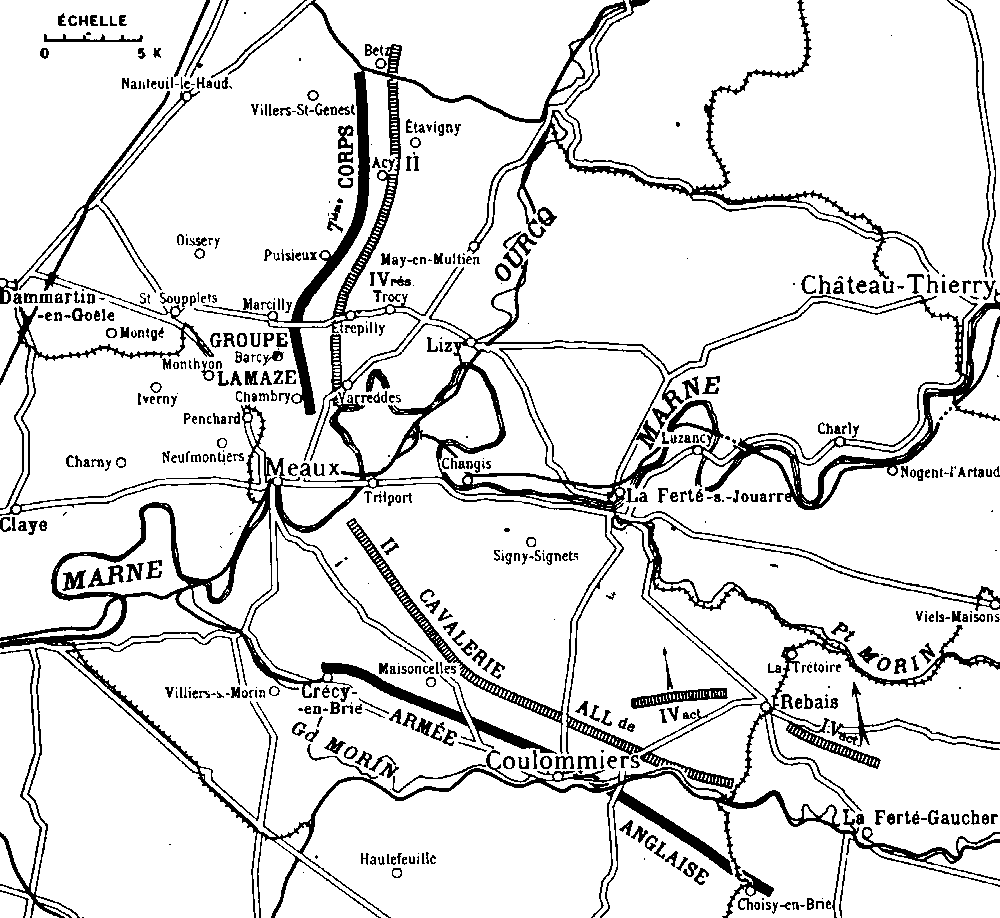 Le 4, l'armée prend ses dispositions de combat ; le 5, elle s'efforce de gagner la position assignée; il s'ensuit une prise de contact très vive avec le IVème corps de réserve. Après de violents combats pour la possession de Monthyon et Penchard, le groupe Lamaze passe la nuit sur la ligne Montgé-Iverny-Charny. Le 7mee corps prend position sur la gauche et n'a que quelques engagements d'avant-garde vers Saint-Soupplets; mais sa menace de flanc contraint le IVème corps à évacuer dans la nuit la ligne Monthyon-Penchard. L'armée anglaise, d'après les instructions du généralissime, doit occuper le 5 au soir une ligne nord-sud allant de Changis (est de Meaux) à Coulommiers, prête à attaquer dans la direction de l'est, afin de prendre de flanc les forces allemandes. Mais les troupes du maréchal French très éprouvées par la dure retraite qui leur a fait parcourir, depuis le 24 août, tout en combattant, 40 à 50 kilomètres par jour, opèrent assez lentement leur volte-face et n'arrivent le soir qu'à la ligne Vaudoy-Pézarches-Hautefeuille-Grand Morin.