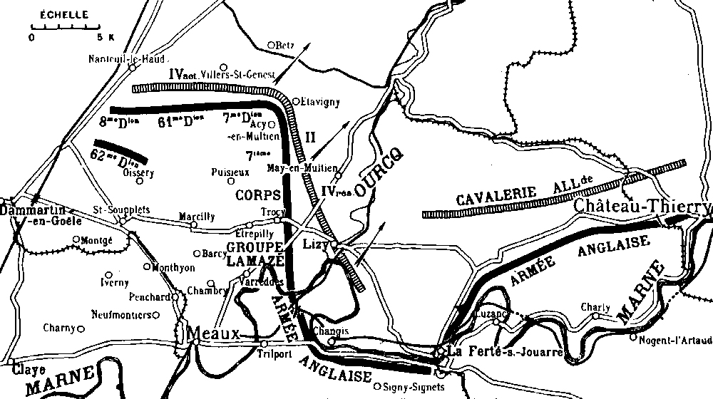 En fin de journée, les Français occupent la ligne Chambry-Marcilly-Puisieux-Acy-en-Multien. L'armée anglaise a continué à se redresser et atteint la ligne Crécy-enBrie-Coulommiers-Choisy-en- Brie.