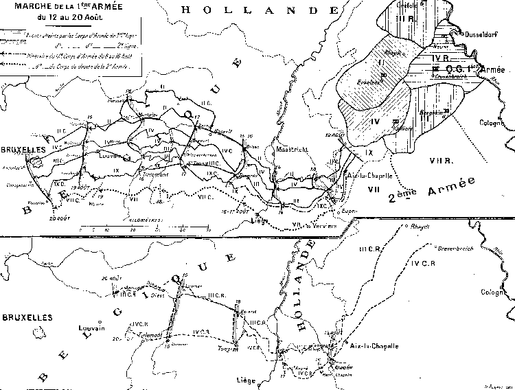 Carte du déploiement et de la progression de la 1ère armée allemande, en Belgique.