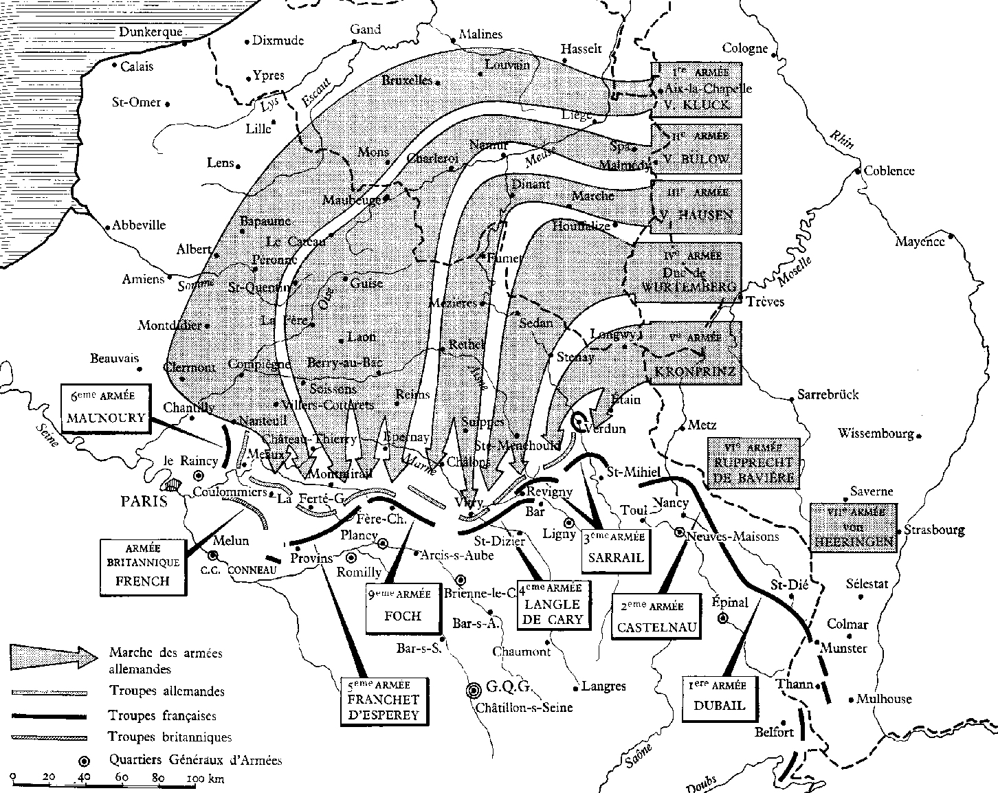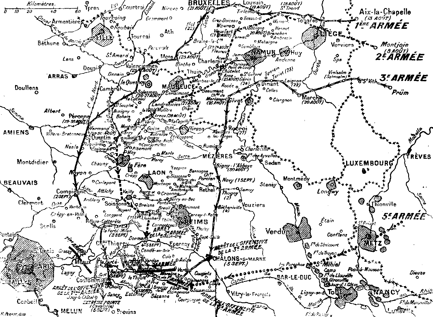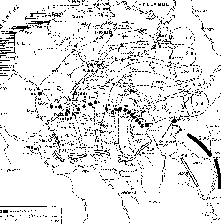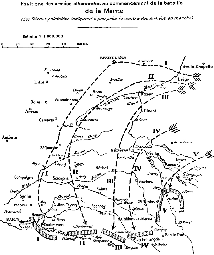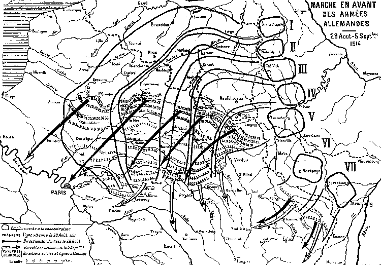 Marche des armées allemandes jusqu'à Paris et au delà de la Marne.