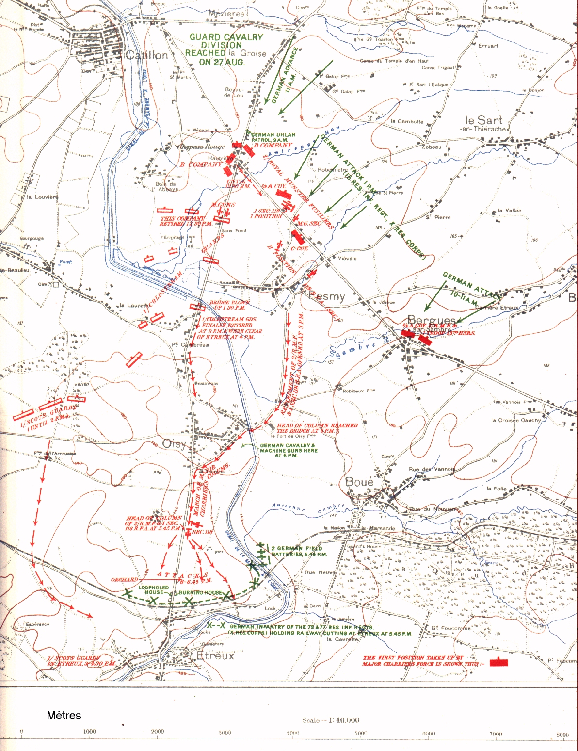 Two companies of the Munsters were about Chapeau Rouge as screen, watching the roads that run north-westwards and northwards to Catillon and La Groise, and the remainder of the rear party were half a mile to the south-east in front of Fesmy. Later, half a company, and one troop of the l5th Hussars, were pushed south-eastwards to Bergues. No sign of the enemy was seen until 9 A.M, when a German cavalry patrol came down the road to Chapeau Rouge from the north, halted within five hundred yards, and fired a few shots. The Munsters made no reply, but the Germans did not come closer. There were indications of another column of the enemy to the north-east, moving south-westwards from Prisches upon Le Sart, straight at the centre of Major Charrier's force ; but its advanced party had galloped back on the appearance of a corporal of the l5th Hussars. By 9.30 A.M. all was again quiet, and Lieut.-Colonel C. B. Morland of the 2/Welch informed Major Charrier that he was going to withdraw the eastern flank guard to Boué (2 miles north-east of Étreux). Br.-General Maxse directed the Munsters to hold on to their position until ordered or forced to retire, and Major Charrier sent back word that, the choice of the route being left to him, he also should fall back by the road to Boué. The best part of an hour passed away, when, towards 10.30 A.M., German infantry came down again from the north-east and opened an attack on Bergues, which a little later was extended also to Chapeau Rouge. The Munsters being by this time entrenched, held their own with little difficulty ; the two guns found a target in a German column to the north-west, and all went well.