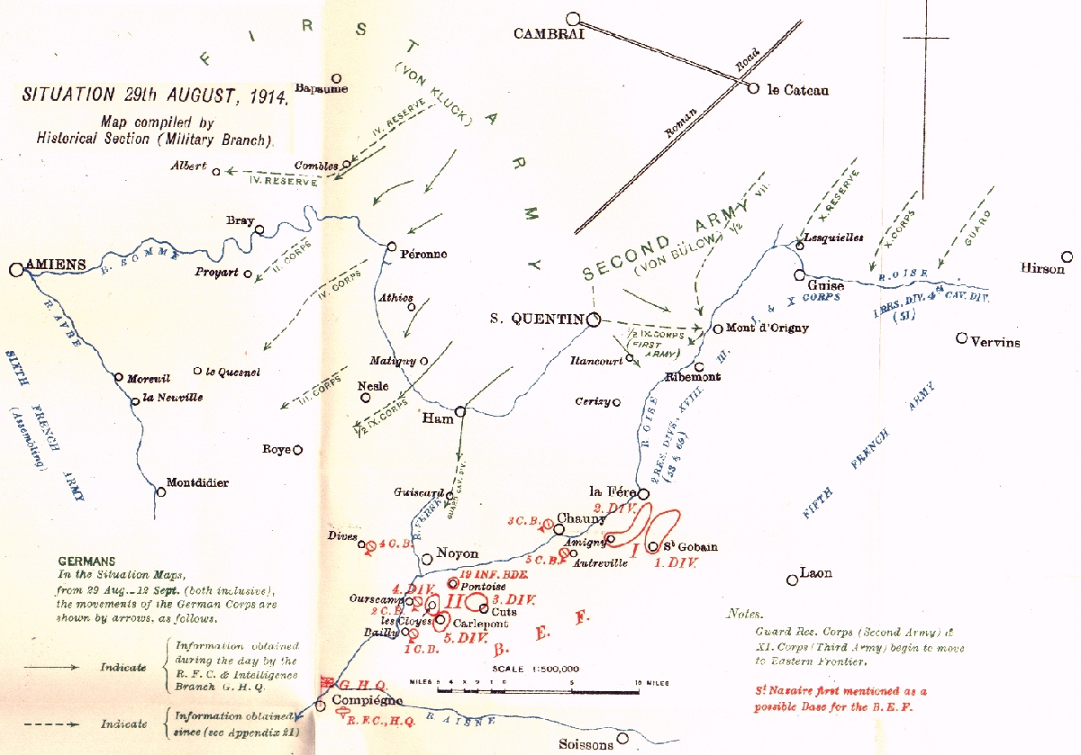 It was tolerably evident that the German pursuit, if it can be said ever to have been seriously begun, had been shaken off. There were, as a matter of fact, already some indications that General von Kluck was pressing south-westward rather than southward. General Sordet's cavalry corps and the 6lst and 62nd Reserve Divisions had been in conflict with German troops about Péronne on the afternoon of the 27th, but British cavalry re-entering St. Quentin at dawn on the 28th found no sign of the enemy. These indications, however, came too late to be of any help to the British Commander-in-Chief on the 27th. As regards the German II. Corps, the most westerly of Kluck's Army, the reports of air reconnaissances in the early morning, taken in conjunction with General Smith-Dorrien's verbal report at midnight on the 26th/27th after the battle of Le Cateau, were reassuring. The road from Le Cateau was absolutely clear ; there were neither British rear guards to be seen north, nor German advanced guards south of a line drawn east and west through Péronne. But, near Guise, a heavy column (Bülow's X. Reserve Corps.) had been observed moving southward on the road between La Groise and Étreux (12 and 6 miles, respectively, north of Guise), besides other troops at Le Nouvion (10 miles north-east of Guise) ; and Sir John French had as yet no clear information to show whether these were friendly or hostile. Soon after 7 A.M. he received, through the French Mission, an encouraging telephone message from French G.Q.G., that the Fifth Army had been ordered to make a vigorous attack abreast of Vervins-Guise against the enemy forces (Second Army) which were following it, and that Sordet's cavalry corps would protect the B.E.F. against an enveloping attack on the left. The enemy forces on the British front, it continued, appeared to be worn out and not in a state to pursue : in these circumstances the B.E.F. could retire methodically, regulating its pace by that of the Fifth Army, so as not to uncover the flank of the latter. At 11 A.M. General Joffre visited Sir John French at Noyon to impress on him that he was already preparing his counter-stroke, but, in order to effect it, needed to fall back further than he had first intended to a line from Reims to Amiens, of which he proposed that the British should occupy the section between Noyon and Roye (12 miles north-west of Noyon). In furtherance of this plan, Sir John French, in a message timed 8.30 P.M., directed the II. Corps, with the l9th Brigade, to be clear of Ham by daylight on the 28th, to march to Noyon and cross to the left bank of the Oise ; the 4th Division to cover the retirement from ground north of the Somme ; and the Cavalry Division to cover both the II. Corps and the 4th Division. He added an order that all unnecessary impedimenta and all ammunition not absolutely required should be thrown away, so that vehicles might be available to carry exhausted men.