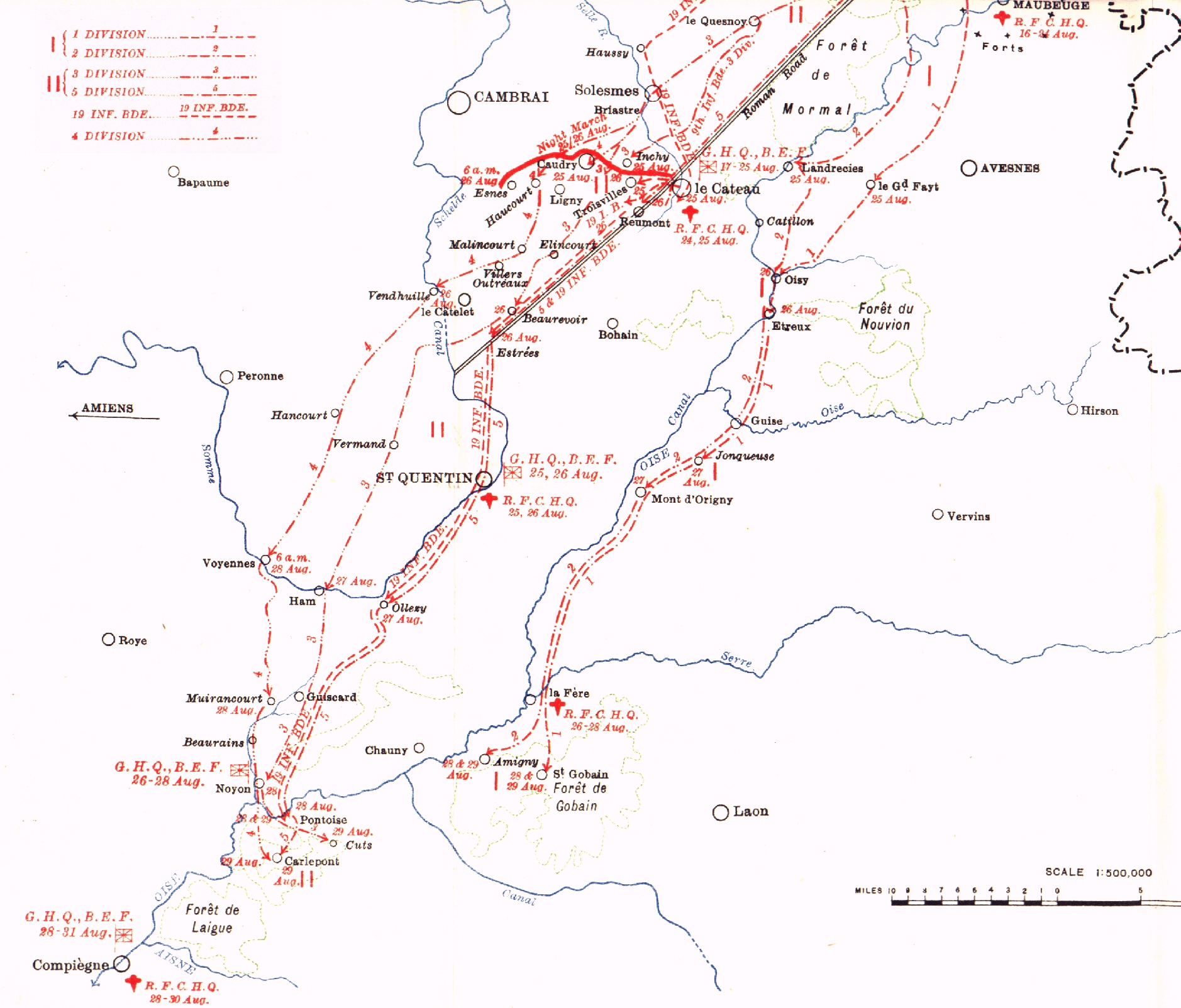 The general line of retirement of the French Fifth Army after Charleroi was south-westwards, its orders being to reach the line Laon-La Fère. The movements of General Valabregue's two Reserve divisions in contact with the British I. Corps have been mentioned. The XVIII. Corps (35th, 36th and 38th (African) Divisions), on their right, retired via Avesnes, and crossed the Oise at Romery (4 miles east of Guise). The III. Corps, next on the right (5th, 6th and 37th (African) Divisions), followed in echelon behind the XVIII. ; it passed the French frontier on the 25th and marched through Fourmies (10 miles south-east of Avesnes), and crossed the Oise between Etreaupont and Ohis. The X. Corps marched via La Capelle to Hirson first south and then south-east, to keep in touch with the Fourth Army, and thence to Vervins. The I. Corps, from the right of the Army, after reaching Tavaux (7 miles south of Vervins), was brought north-west into second line between the III. and X. Corps.