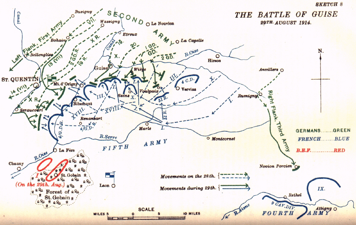 On the evening of the 28th August, two corps (XVIII. and III.) of the French Fifth Army proceeding westwards were halted, in echelon, south of the Oise, east of Guise, under cover of the X. Corps, the 1. Corps being in reserve to the south-east. General Lanrezac's troops were thus in touch with, but in advance of, the British Army. During the day, General Valabregue's Reserve divisions, which since the night of the 25th/26th, as already described, had marched so close to the I. Corps as sometimes to share its roads, had had hard fighting at the Oise bridges near Guise, had lost the bridges and withdrawn at nightfall to the left of the line of the Fifth Army.