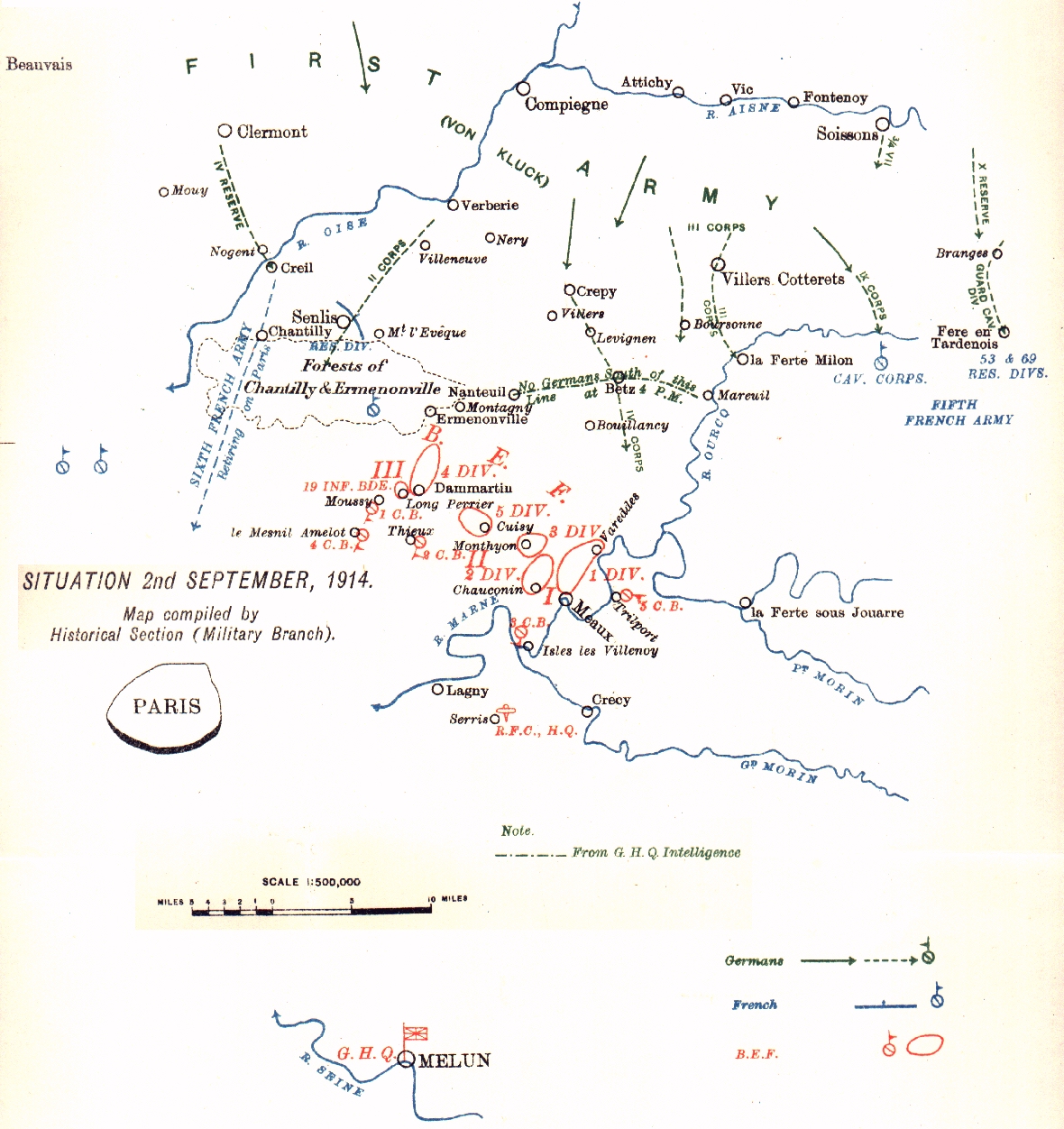 The 2nd September had thus passed more or less uneventfully for the troops, but aerial reconnaissance confirmed interesting changes on the side of the enemy, which had been suspected on the previous day. His general march south-eastward seemed for the time to have come to an end, and to have given place to a southerly movement. The general front of Kluck's Army was covered by cavalry from Villers Cotterêts through Crépy en Valois and Villeneuve to Clermont. (The II. Cavalry Corps was, according to Kluck, in line between the IV. and II. Corps, so part of the covering cavalry was divisional.) Behind it from east to west opposite the British were the III., IV. and II. Corps, and there were indications that the heads of the columns were halting to allow the rear to close up, as if apprehensive of danger from the south. The IV. Reserve Corps was to the right rear north-west of Clermont about St. Just, and the IX. Corps was east of Villers Cotterêts, on the same alignment as the cavalry. Up to 4 P.M. no hostile troops of any kind had passed a line, about ten to twelve miles away, drawn from Mareuil (at the junction of the Clignon with the Ourcq) westward through Betz to Nanteuil le Haudouin. In fact, it seemed as though Kluck had not foreseen any such collision with the British as had taken place on the 1st. Possibly he believed them to have moved south-eastward, and such, indeed, had been their direction on the 30th, though on the 3lst it had been changed to south-west to leave more space for the retreat of the French Fifth Army. Moreover, but for the exhaustion which prevented the right and centre of the British Army from reaching the halting-places ordered for the evening of the 3lst, it is probable that there would have been no serious collision at all between the British and the Germans on the 1st September, but that the Germans would have merely brushed against the British rear guards, reported the main body to be still in retreat, and continued their south-easterly march to take the French Fifth Army in flank. Events, however, having s fallen out as they did, Kluck had made one further attempt to cut off the British. Meanwhile on his left Bülow was pressing forward against the French Fifth Army and had, with his main body, reached the line of the Aisne from Pontavert (14 miles north-west of Reims) to Soissons, the head of his advance being on the Vesle. On his front, the Fifth Army had fallen back to the line Reims-Fère en Tardenois.