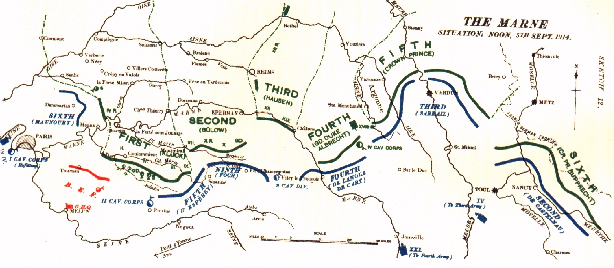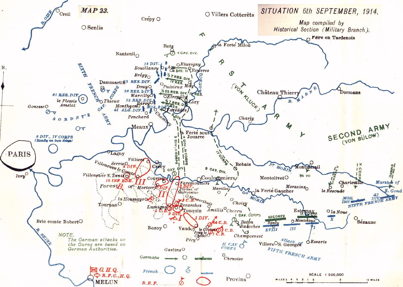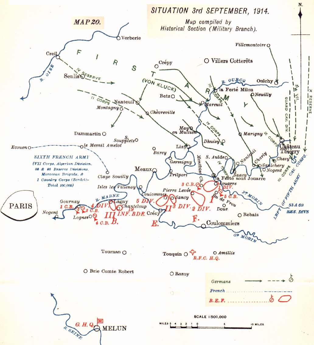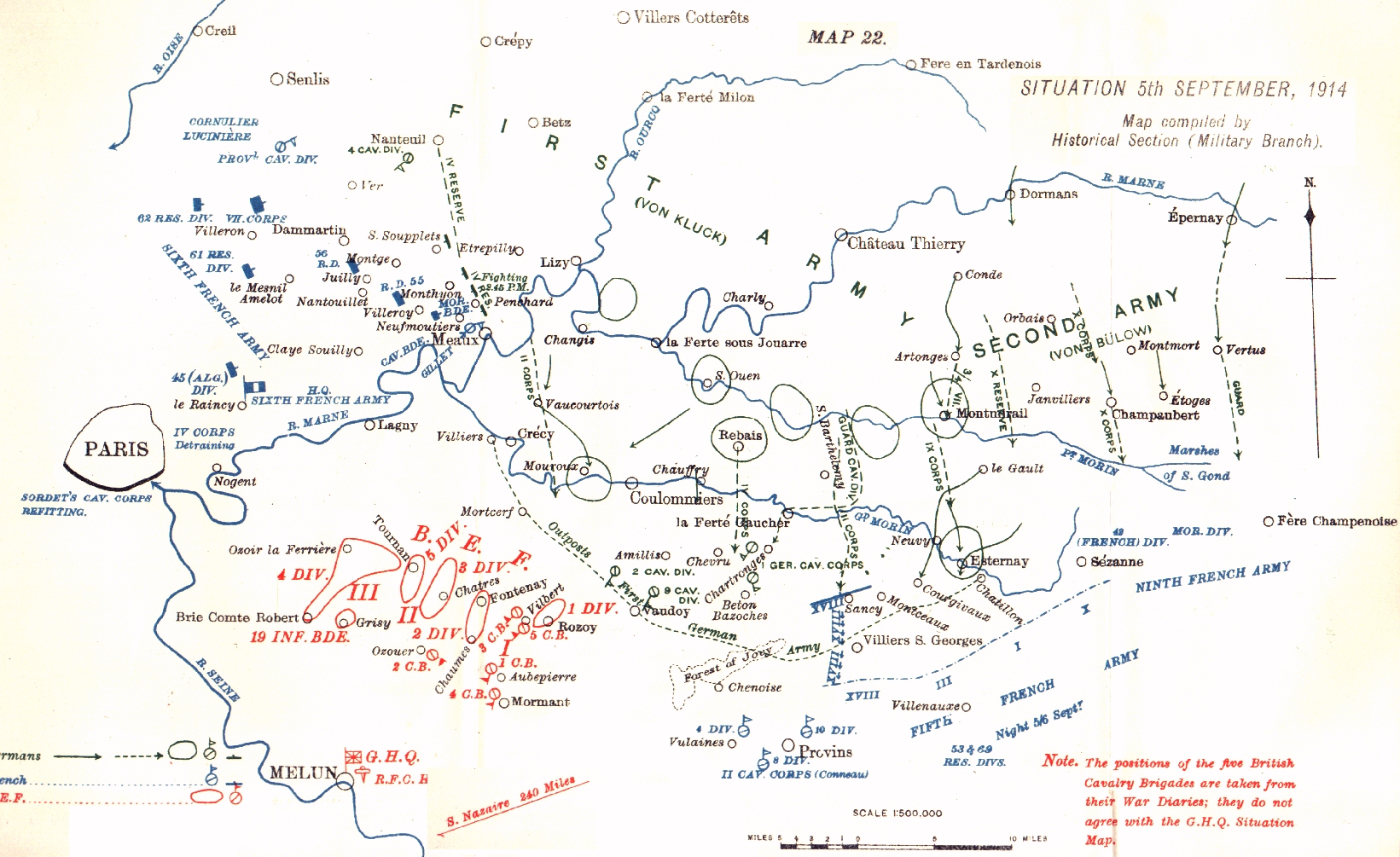 Meanwhile, during the 5th September, north-east of the capital, General Maunoury's Sixth Army had by General Galliéni's orders advanced north of the Marne towards the Ourcq, and in the afternoon had come into contact with the German IV. Reserve Corps between Meaux and St. Soupplets. This Army was steadily increasing in numbers as divisions reached it from the east. (It consisted on the 5th September of the VII. Corps (l4th and 63rd Reserve Divisions), 45th Division, 55th and 56th Reserve Divisions, the Moroccan Brigade, and Gillet's cavalry brigade-some 70,000 men, with Sordet's cavalry corps attached. Behind it were a group of Territorial brigades under General Mercier-Milon, Ebener's Group of Reserve divisions (6lst and 62nd), and the actual garrison of Paris, four divisions and a brigade of Territorial troops, with a brigade of Fusiliers Marins sent for police duties. The IV. Corps was just arriving, so General Galliéni reckoned he had about 150,000 men available for action as the Army of Paris.) On the right of the British, and slightly to the south of them, General Conneau's cavalry corps (4th, 8th and 10th Cavalry Divisions) was near Provins, on the extreme left of the Fifth Army, which had continued to retire during the 5th, and was now extended north-eastwards from Provins to Sézanne. Thus the gap in the Allied line on this side was some fifteen miles, with four French and British cavalry divisions at hand to fill it.