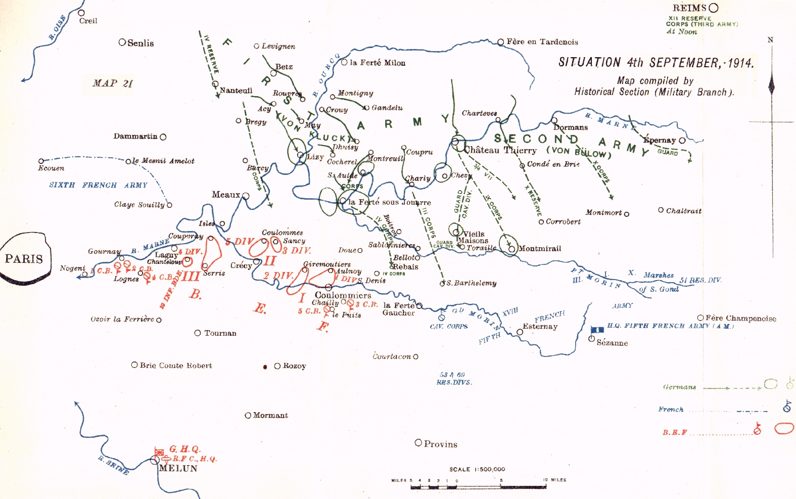 Meanwhile, by General Haig's orders, the 1st Division had at 4 A.M. been withdrawn into reserve and relieved in the duty of observation over the front from La Ferté to Sammeron (3 miles west of La Ferté) by the 2nd Division. There was some expectation of fighting ; for, although the bridges at Sammeron and St. Jean had been blown up, one of the two bridges at La Ferté sous Jouarre owing to lack of time had not been thoroughly destroyed. (The four bridges had been dealt with by the 23rd and 26th Field Companies R.E. The demolition of the stone-arched bridge at La Ferté was successful ; the second was a six-arched steel girder bridge, and the girders were cut through ; but the ends remained as cantilevers, and the gaps could be crossed by laying a few planks. There was no time to place heavy charges to complete the demolition.). About 8 A.M. indeed a German battalion crossed the river by this bridge, (The German IV. Corps and II. Cavalry Corps crossed at La Ferté sous Jouarre.) but it did not immediately press on, and the 1st Division, pursuing its march methodically, halted at Aulnoy and Coulommiers. During the afternoon Sir John French visited I. Corps headquarters and gave General Haig orders to withdraw, thus for the second time preventing him from fighting. The 2nd Division, which at 4 P.M. began to fall back by brigades in succession to the west of the 1st Division, upon Mouroux and Giremoutiers, was followed only by a few cavalry patrols. The II. and III. Corps and Cavalry Division actually enjoyed a day of rest on the 4th until after dark, when they too moved off south through the night, as will be related. For the moment the Army was concentrated on the Grand Morin.