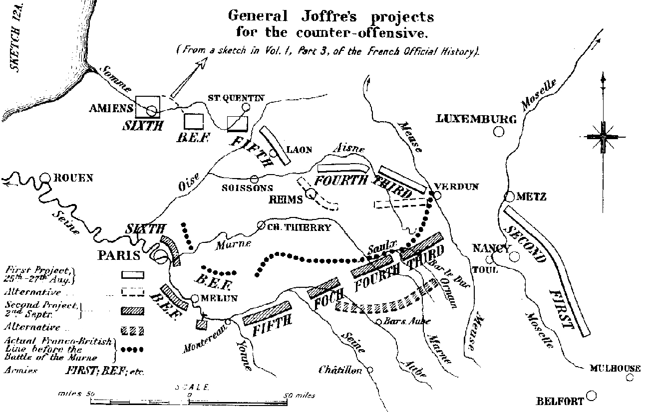 " Of the two proposals which you have made to me relative to the employment of the troops of General Maunoury, I consider the more advantageous one is to send the Sixth Army on the left [south] bank of the Marne, south of Lagny.