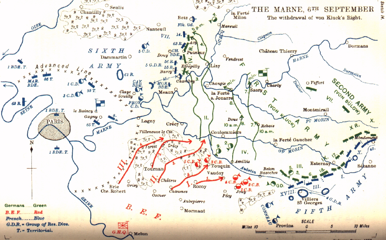 There had been a collision, the beginning of " the Battle of the Ourcq," as we have seen, on the afternoon of the 5th, between the leading troops of General Maunoury's Sixth Army and the flank guard of the German First Army, under General von Gronau, consisting of his IV. Reserve Corps and the remains of the 4th Cavalry Division (cut up at Néry). The German force, " driven into a semi-circle of 2 1/2 miles radius, and under fire of superior artillery," had, during the night, fallen back and broken contact. During the 6th, a day of taking contact all along the front, the Moroccan Brigade, 45th, 55th Reserve, 56th Reserve, 63rd Reserve and l4th Divisions had moved forward, getting touch with the German infantry from 10.30 A.M. onwards, and driving it in, so that at night, after Gronau had been reinforced, the two opponents were facing each other west of the Ourcq on a nearly north and south line, Varreddes (north-east of Meaux)-Etrepilly-Acy. There, with little change except extension northwards, they were to remain until the last day of the battle. Between the right of Maunoury's Army and the left of the B.E.F. there was a gap of eight miles, in which, tending to increase the separation, lay both the Marne and its tributary the Grand Morin. At 4.30 P.M., however, G.Q.G. telephoned to G.H.Q. stating that a division and a cavalry brigade would arrive early on the 7th on the left of the B.E.F. to fill the gap and furnish support to the British left flank.