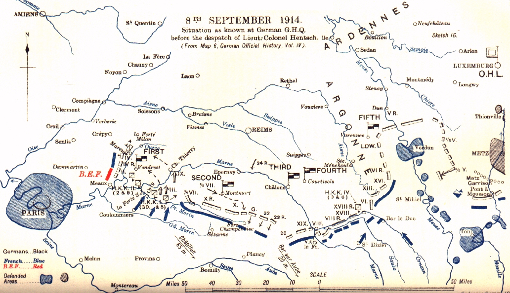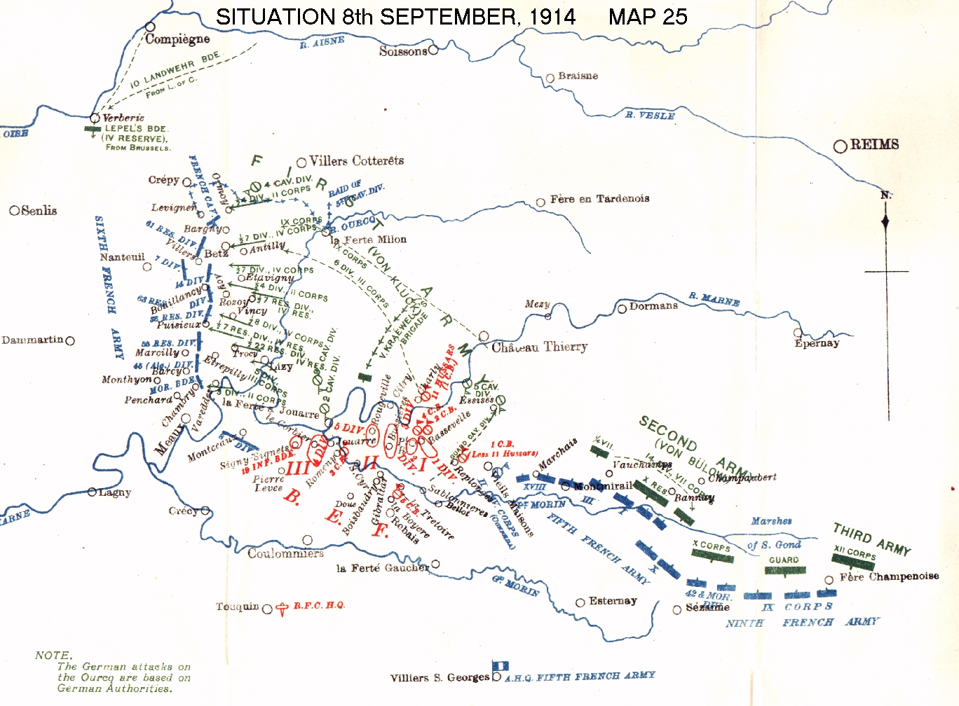 The air reports of the day referred, except for the passage of many troops through La Ferté, almost entirely to small enemy columns, and to the positions of the British and of the French Armies on either side of them. The lines of march of the German IX. and III. Corps were beyond the areas reconnoitred except those of the 5th Division through La Ferté, and of a large detachment of the IX. Corps, which, as we shall see, had been diverted to the British front, which were duly reported. The French stated that the III. Corps (or the IX.) was still on the Fifth Army front next to the VII. Corps, where the IX. Corps had been on the night of the 7th/8th. Thus the general situation of the German forces near the British was summed up by the Intelligence Section as follows : the two divisions of the I. Cavalry Corps had fought on the Petit Morin and had retired northwards ; the III. Corps on Fifth Army front ; the IX. Corps north of the Marne, part (actually a quarter) near Montreuil aux Lions (6 miles N.N.E. of La Ferté), part (actually the 5th Division) near Cocherel (5 miles N. by W. of La Ferté) and part (actually the tail of the l8th Division) near Chézy (5 miles south of Chateau Thierry) ; and the IV. Corps was thought to be divided, part being on the Ourcq, and part on the northern bank of the Marne near Nanteuil (what was seen must have been either the tail of the 6th Division or the retiring 5th Cavalry Division). Thus it appeared that the greater part of the IV. and IX. Corps (actually only one division and one mixed brigade, and that division under orders to continue its movement to the Ourcq) was opposite the British on the north bank of the Marne, quite enough to make Sir John French feel cautious when forcing the passage of a wide river.