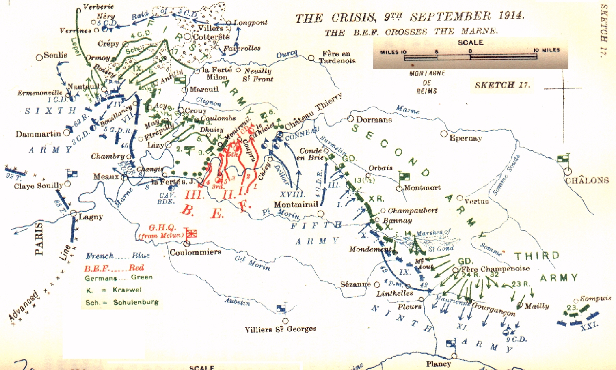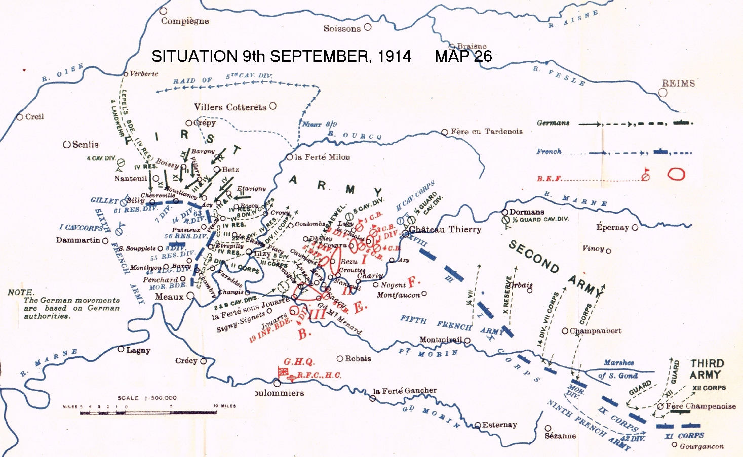 The 9th September, though we now know that the advance of the B.E.F. was the decisive factor in influencing the Germans to abandon the field of battle, seemed at the time a disappointing day for the British, despite their passage of the Marne. The more so since General Maunoury, having been hard pressed on his left and left flank throughout the 8th, had asked for a brisk attack against the left flank and rear of Kluck. Had the entire British line been able to come up level with the 9th Brigade when it reached the road from Chateau Thierry through Montreuil to Lizy sur Ourcq at 9 A.M., great results might have followed ; for Kluck's left was then well to the south of Lizy, and by a general advance Kraewel's force at Montreuil would have been swept away or surrounded. But the I. Corps, on the right, was halted for several hours on account of a misleading air report that there were large enemy forces north of Chateau Thierry, and the French on its right were too far in rear to give assistance in case of counter-attack ; the III. Corps, on the left, was held up by the destruction of the bridges at La Ferté sous Jouarre.