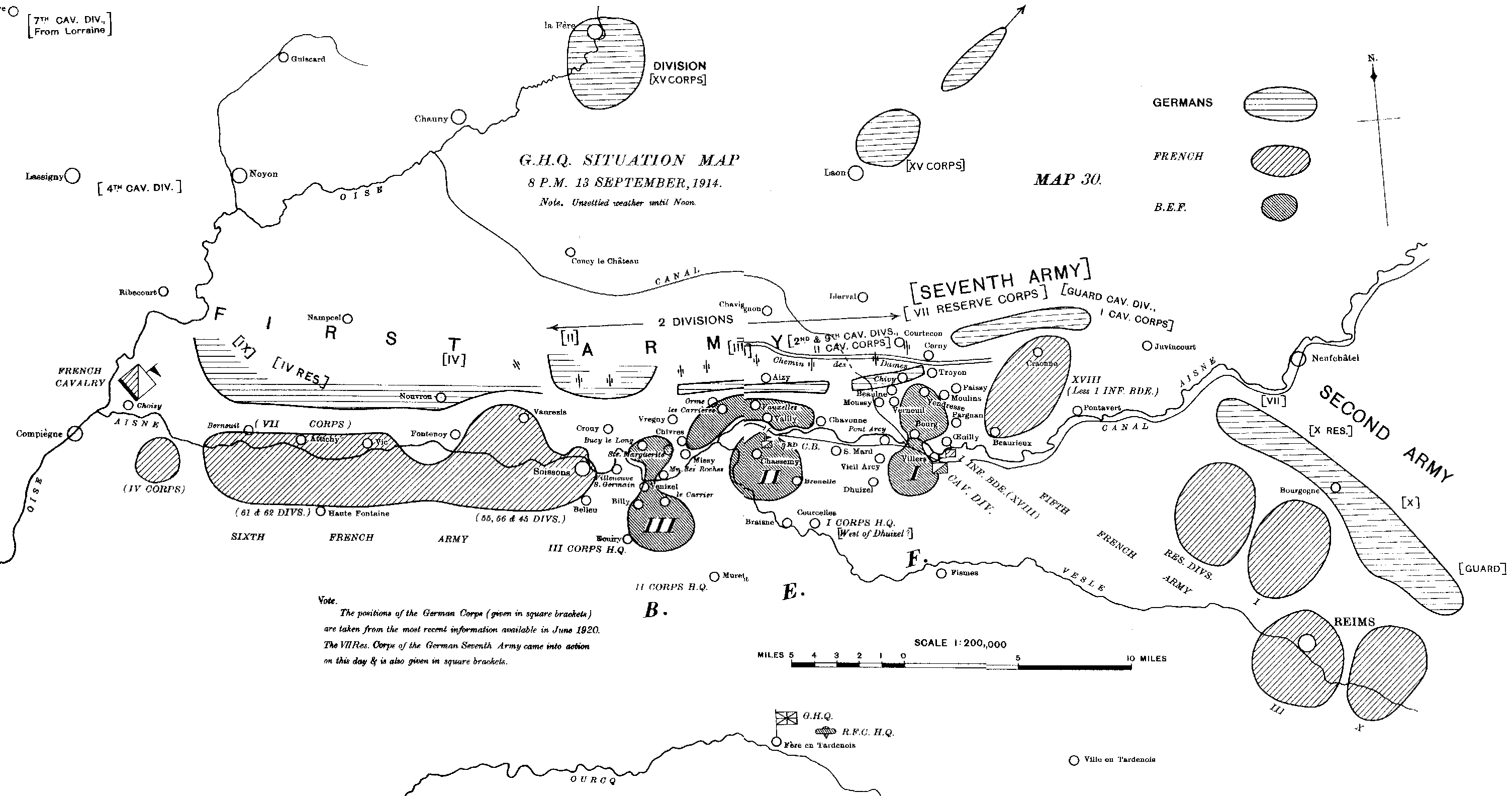 These incidents put a stop to the advance on Chivres. The two battalions of 14th Infantry Brigade had not been able to assist much, as having to change direction under shrapnel fire they did not come up until the moment for co-operation had passed, and then behind rather than on the right of the 12th Brigade. The Lancashire Fusiliers clung to their ground until nightfall, when the Manchester came forward to relieve them. They had lost 6 officers and over 170 men, and were obliged to leave many of their wounded on the ground, as they were too near the German trenches to permit of removal. It was long before any troops of the Allies approached nearer than the Lancashire men had to the commanding promontory of Chivres. However, a passage at Moulin des Roches had been effected; and at 9 P.M. the 15h Brigade marched down to the raft which the 14th had used and began crossing the river, leaving behind their horses and vehicles to follow at daybreak. Thus before dawn of the 14th September a footing, albeit a precarious one, had been gained on the north bank of the Aisne at several points. The situation of the British Army was as follows :