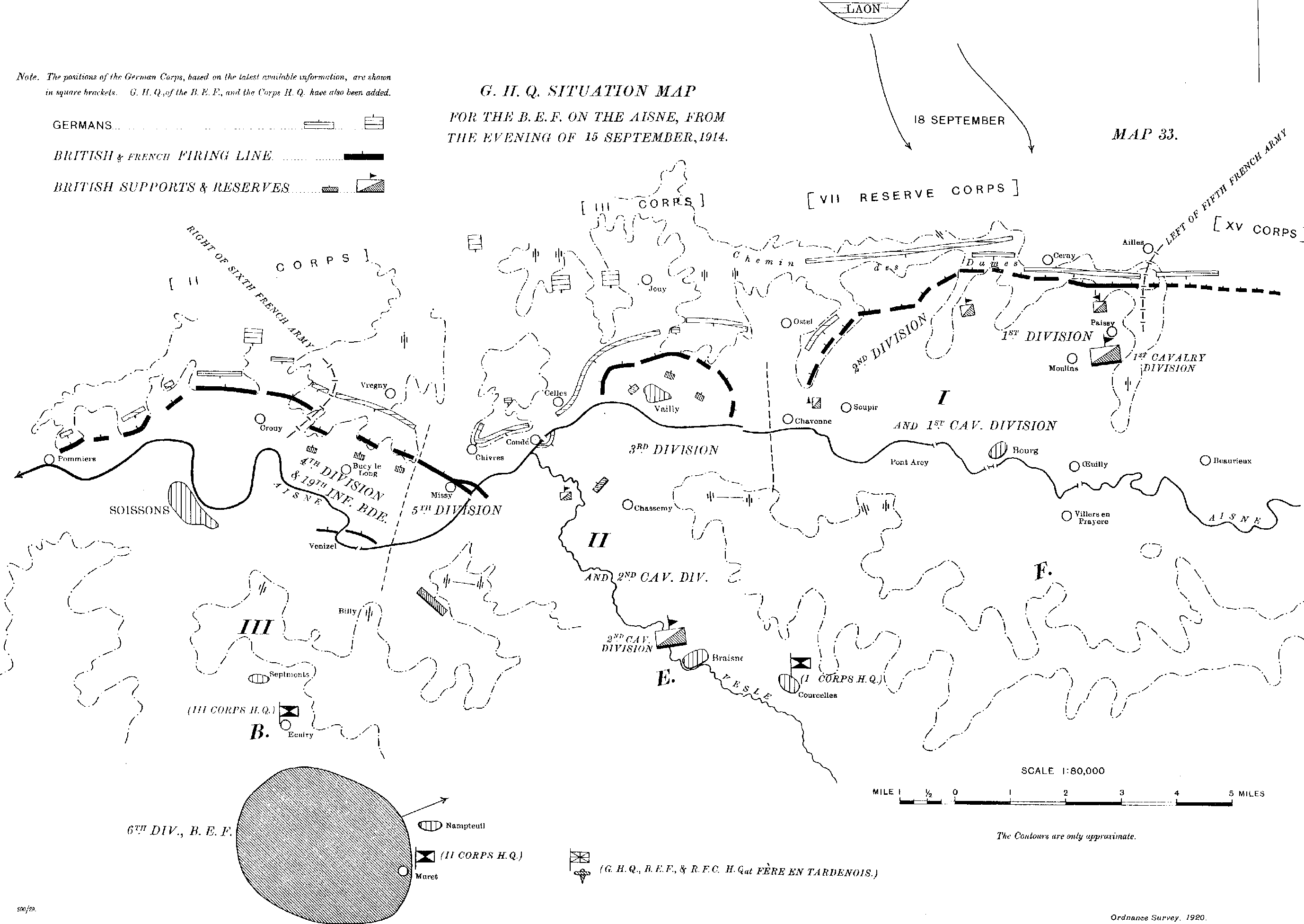Altogether the 20th September was a successful day for the British, though it cost the B.E.F. nearly twenty-two hundred killed, wounded and missing. The Germans had delivered four serious attacks at four different points and had, after first gaining some little advantage, been everywhere repulsed. The French immediately to the right and left of the British were subjected to similar onslaughts with much the same result. The Fifth and Sixth Armies were both forced back a little at certain points ; but the lost ground was recovered by the latter before nightfall and by the former within twenty-four hours. (G.O.A. (v. pp. 70-1) makes no claim of any success on the Aisne front on the 20th. The XV. Corps failed to storm Hurtehise Farm (west of Craonne) ; the XII. Corps (part of which attacked the West Yorkshire), in a fight of varying fortune, managed to hold its ground ; the VII. Reserve Corps reported that its troops were so exhausted that, at best, it could only hold the line ; the III. Corps had some local fighting without result.) The Germans were evidently most anxious to hold the Allies to their ground and prevent them from shifting troops to their western flank ; for already there were indications of a general movement of German units from east to west.
