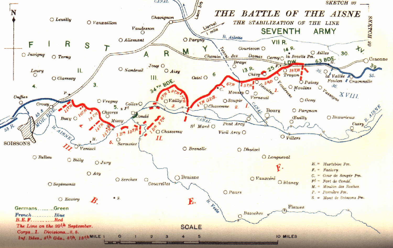 To the right and left of the British the French persisted steadily in their offensive. On the right Craonne and Corbeny (1 1/2 miles north-east of Craonne) were constantly changing hands, though on the evening of the 17th they were finally left in possession of the enemy. The arrival of the German XII. Corps in that quarter checked any further progress on the part of the French XVIII. Corps.