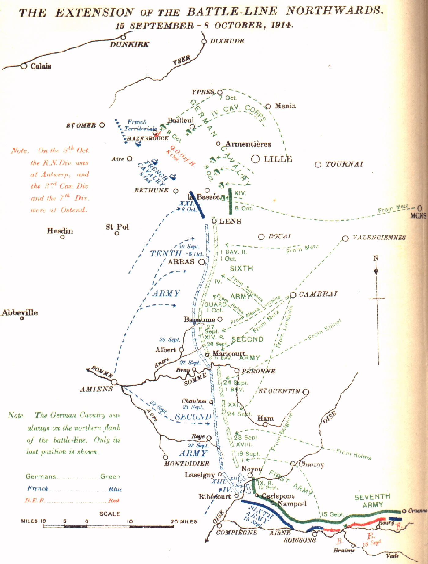 Thus by the 9th October, on both sides, the battle line had been extended from the Aisne westwards and northwards to within 30 miles of Dunkirk and the coast.